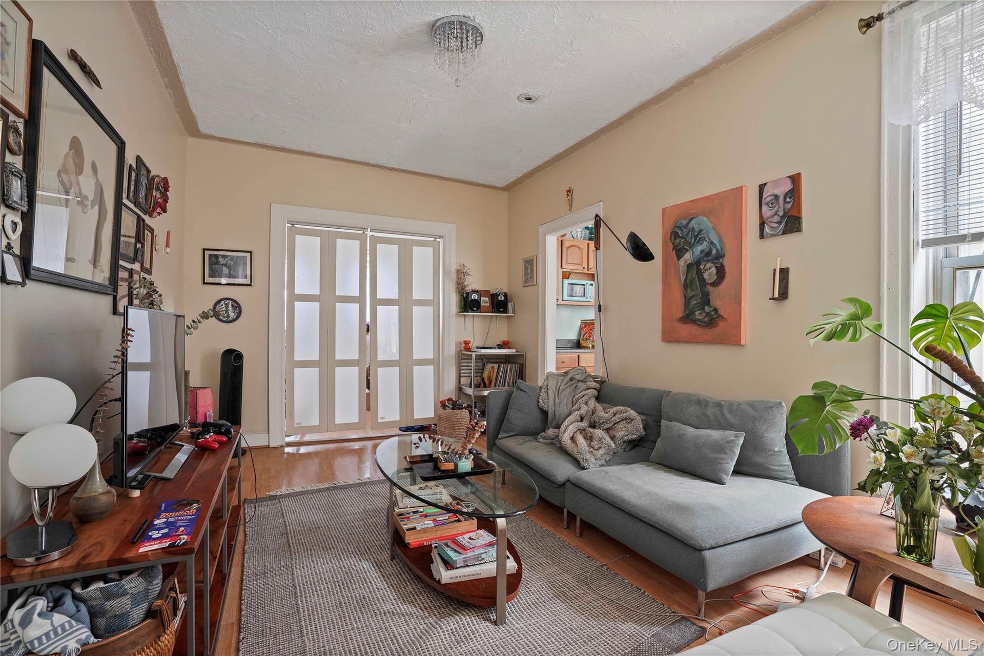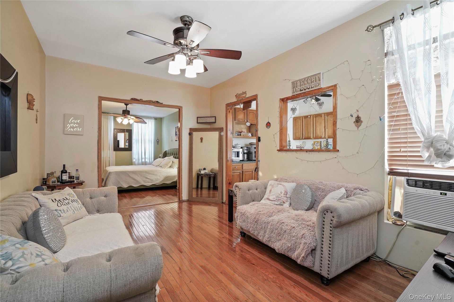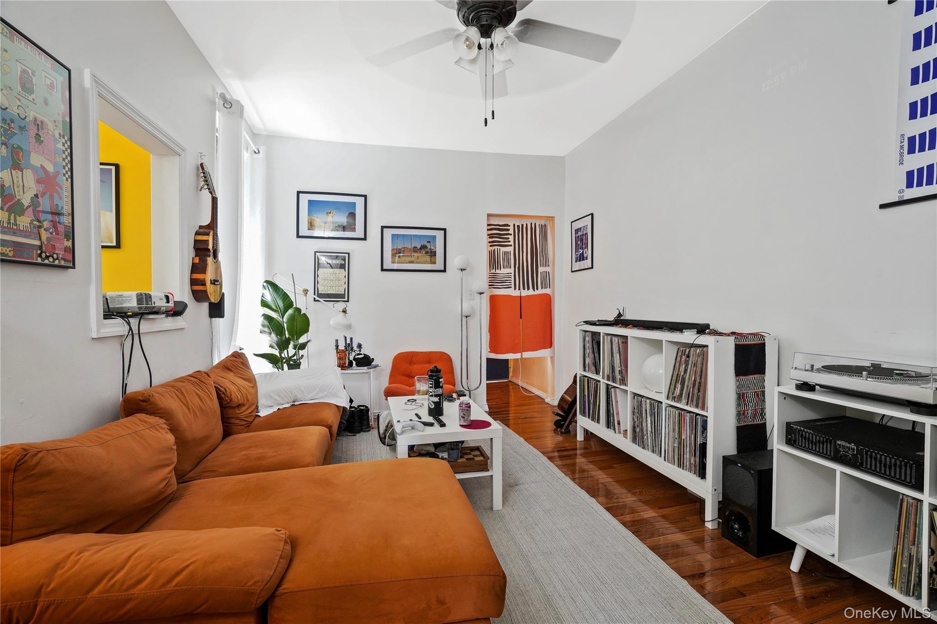 - First floor apt. Living room with wood-type flooring and ceiling fan