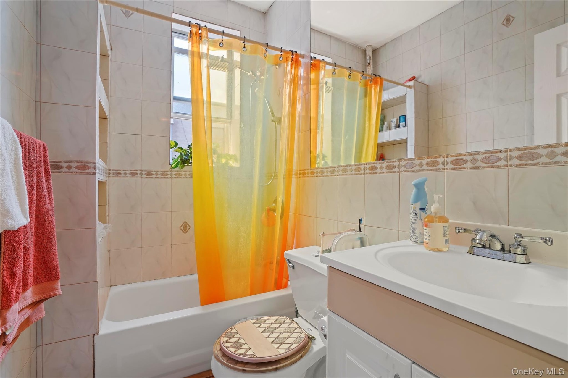 - Full bathroom featuring tile walls, vanity, and shower / bathtub combination with curtain