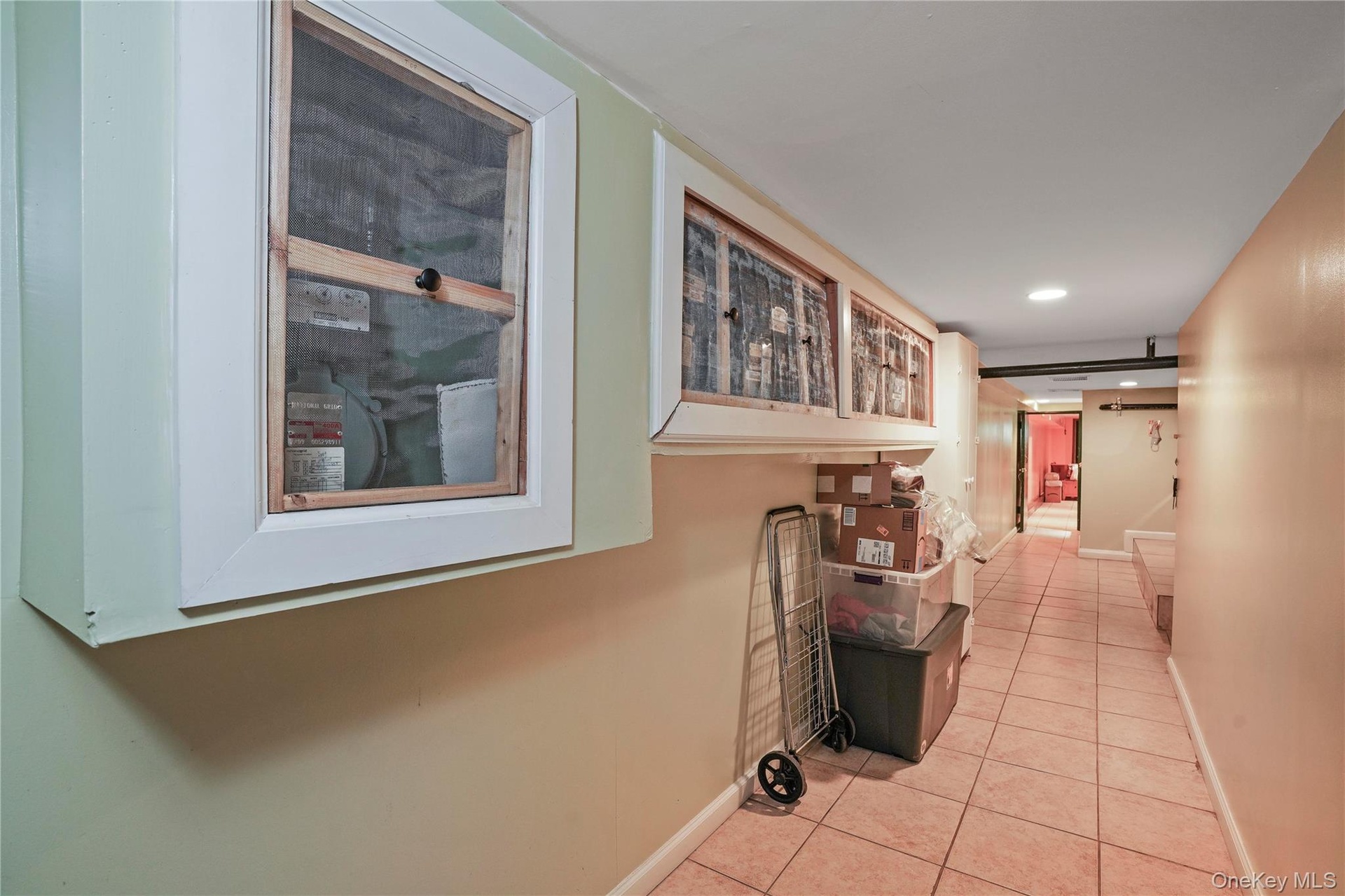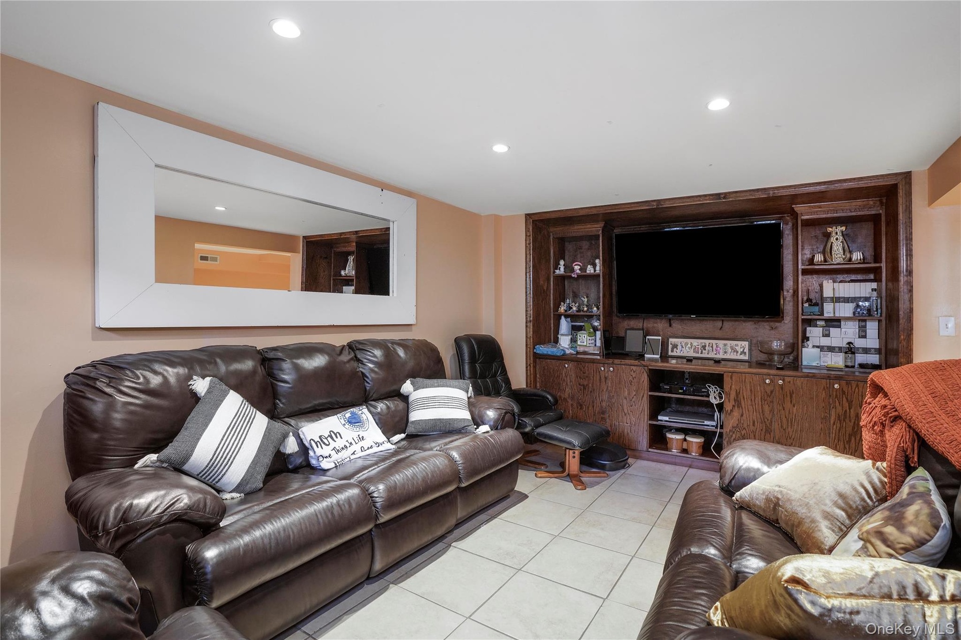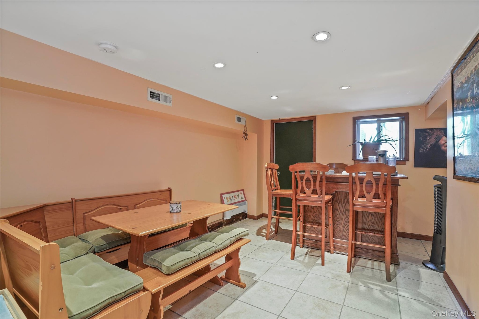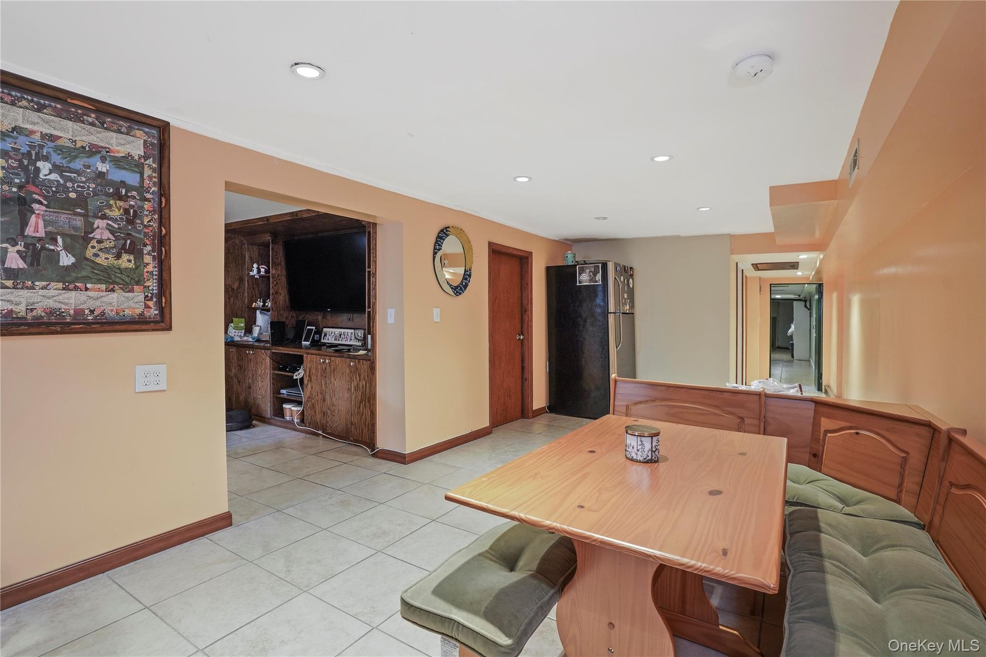 - Dining room featuring light tile patterned flooring and recessed lighting