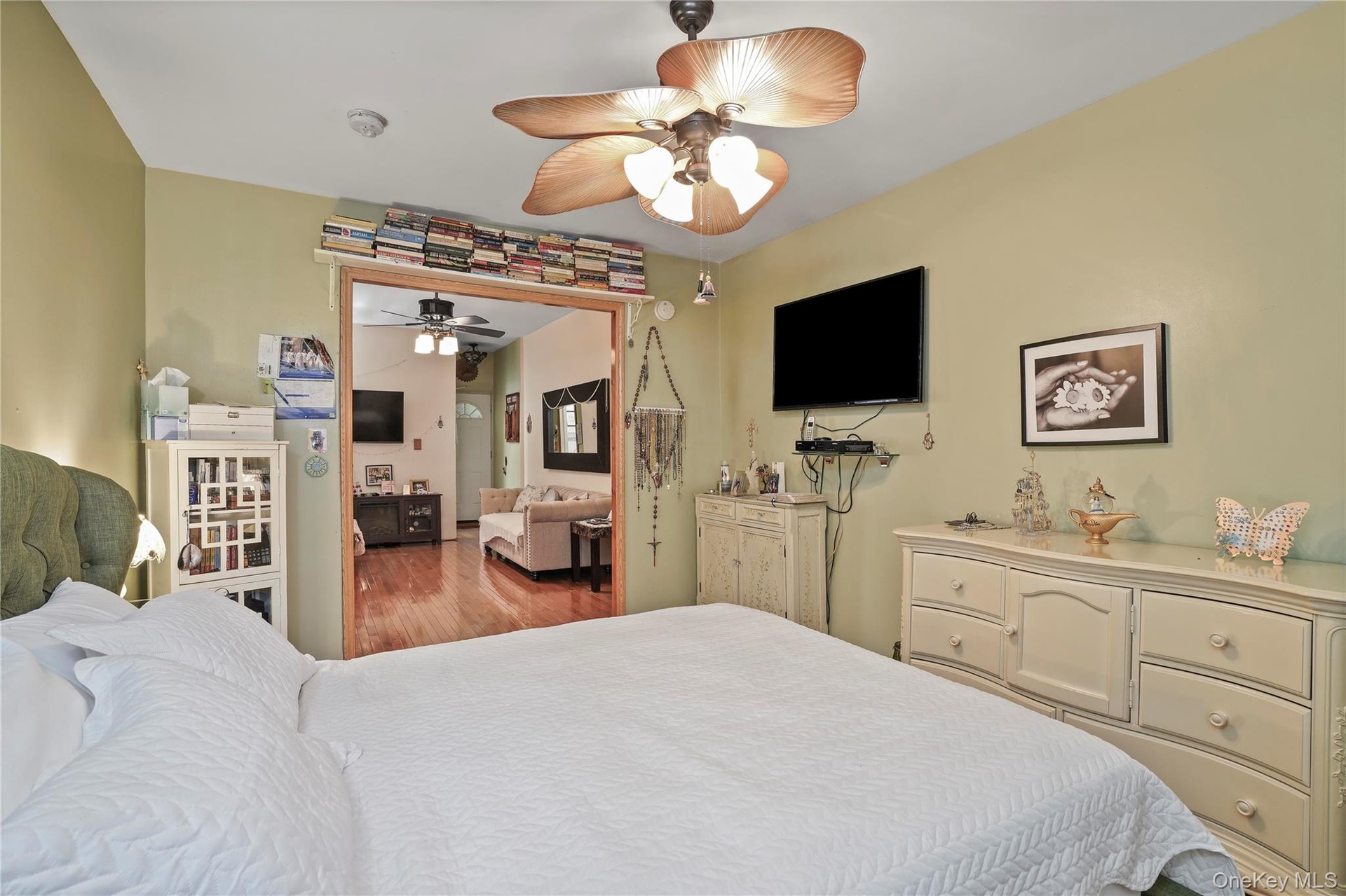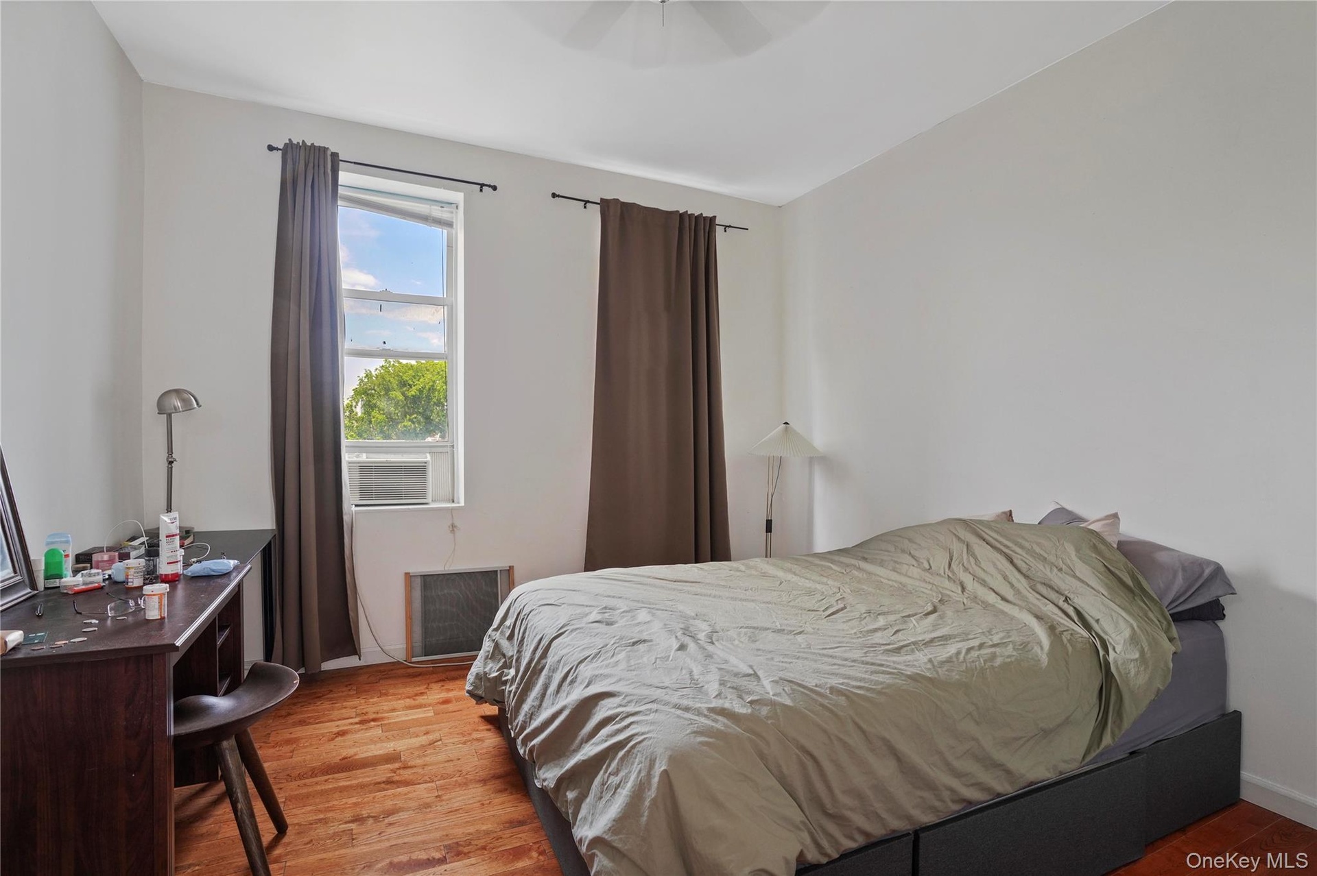- Bedroom with wood finished floors, a ceiling fan, and cooling unit