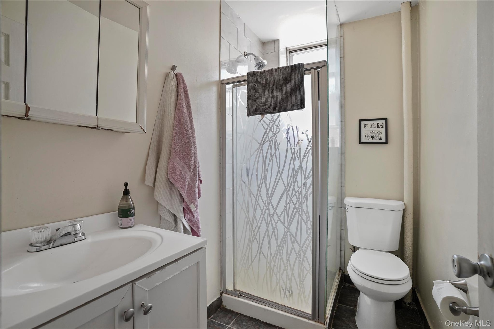 - Bathroom featuring tile walls, a stall shower, vanity, and tasteful backsplash