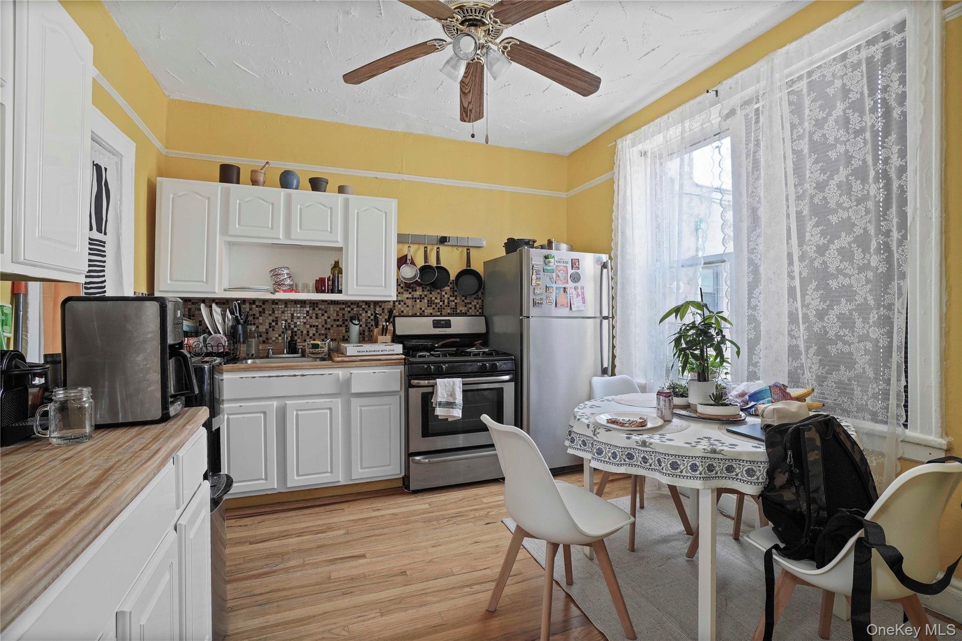 - Kitchen featuring appliances with stainless steel finishes, light wood-style flooring, white cabinets, a ceiling fan, and decorative backsplash