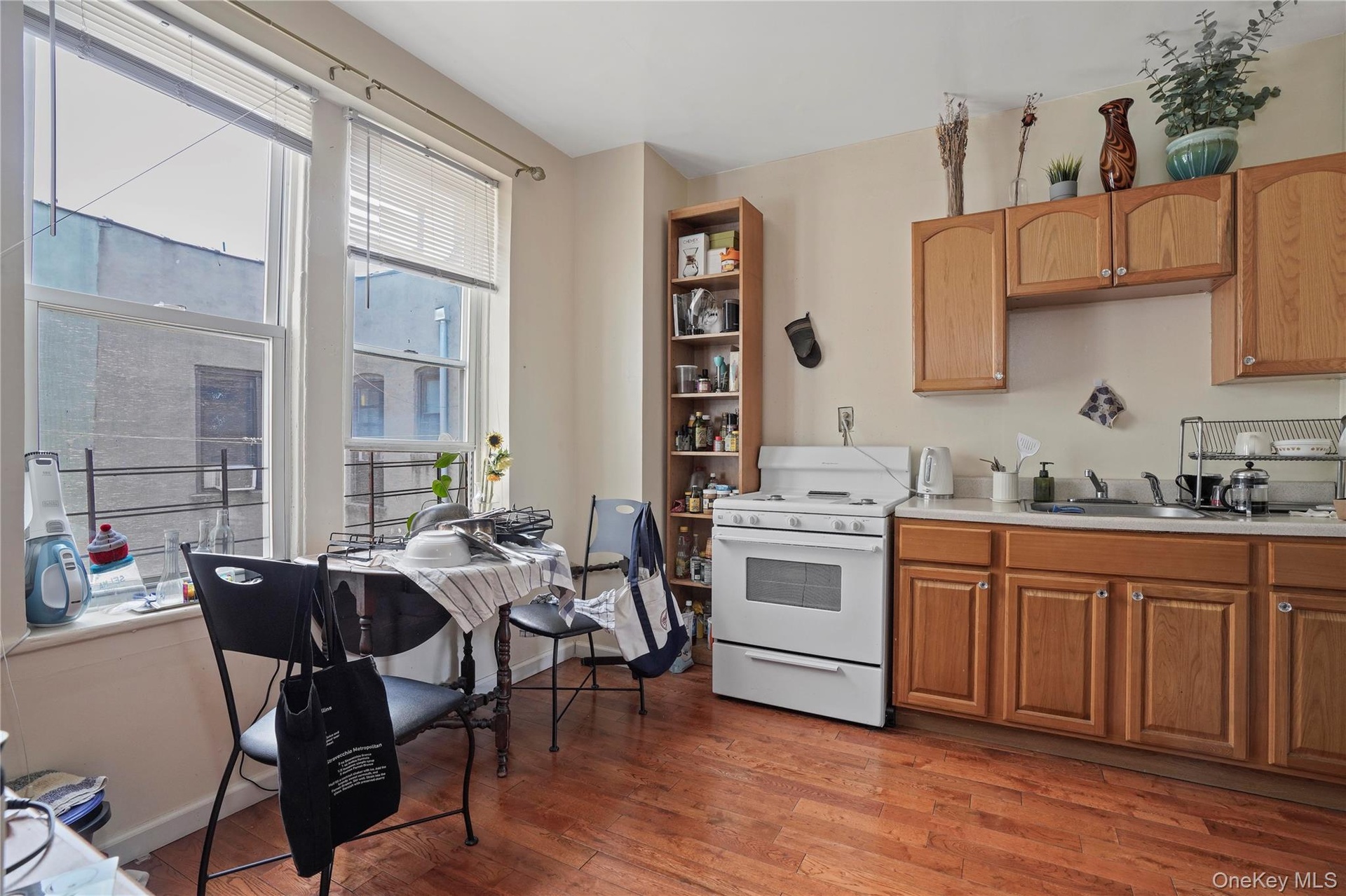 - Third floor Kitchen with gas range gas stove, light wood-type flooring, light countertops, and open shelves