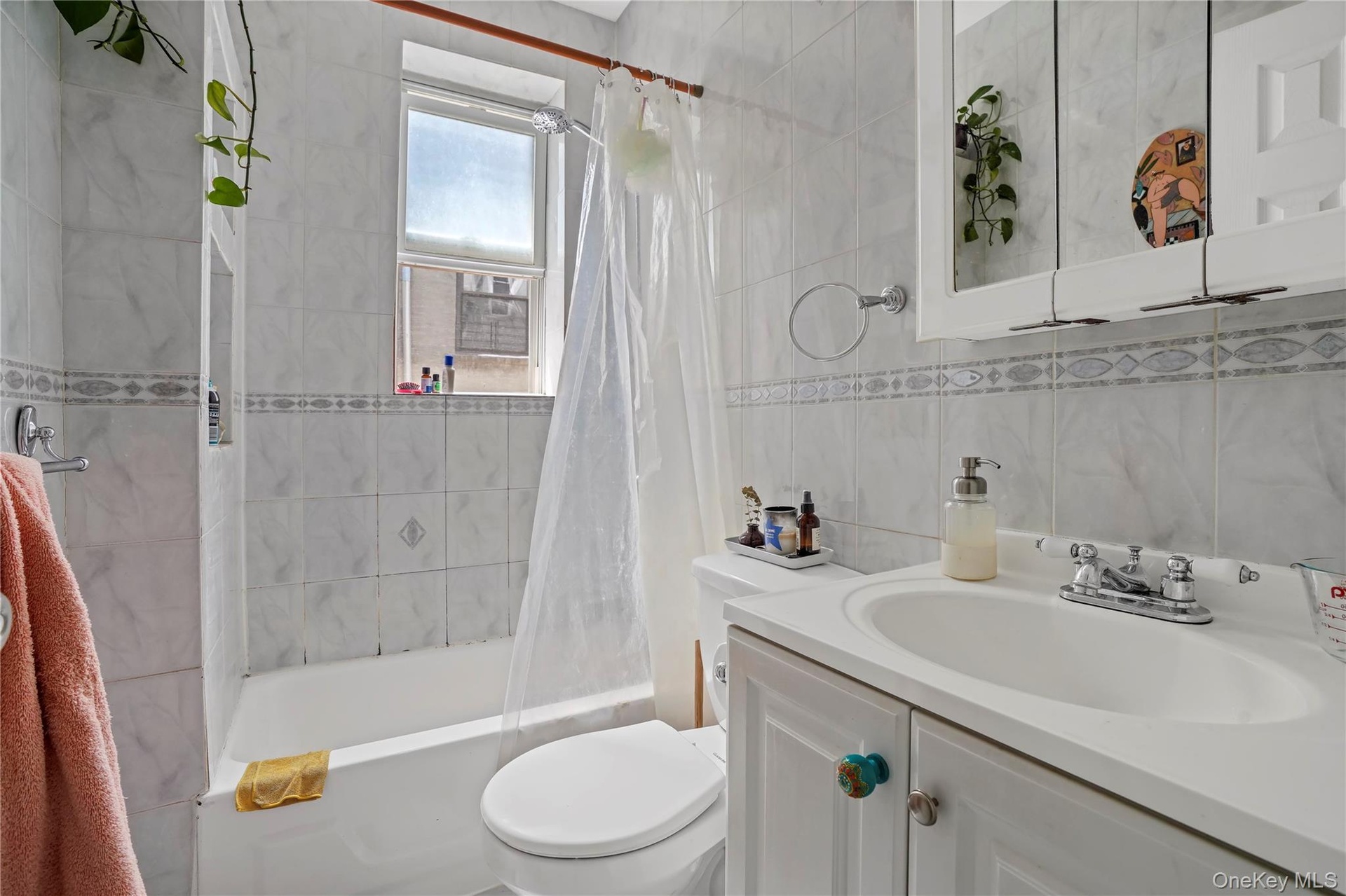 - Full bathroom with shower / tub combo, vanity, and tile walls