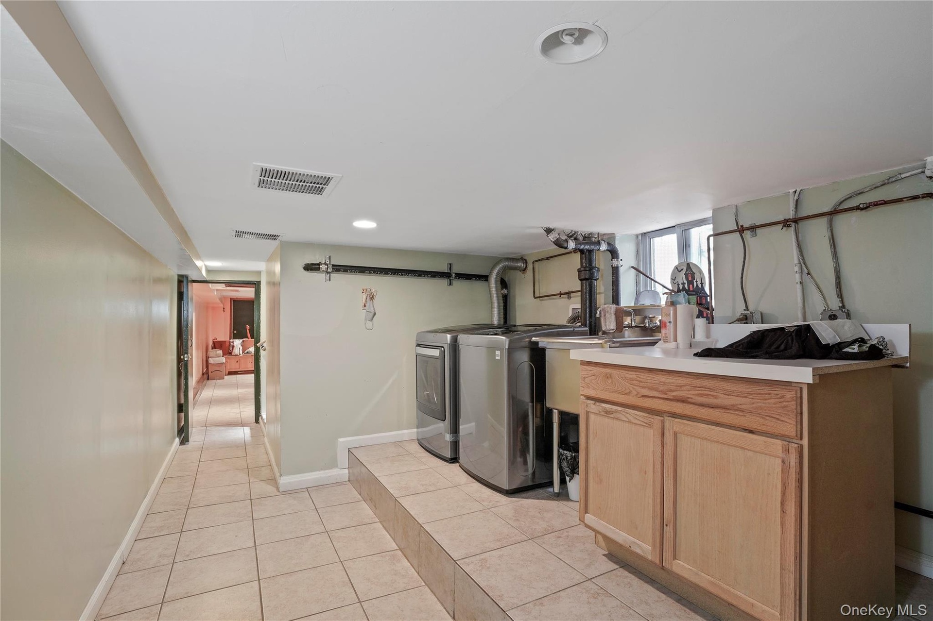- Laundry area featuring independent washer and dryer, light tile patterned floors, and recessed lighting