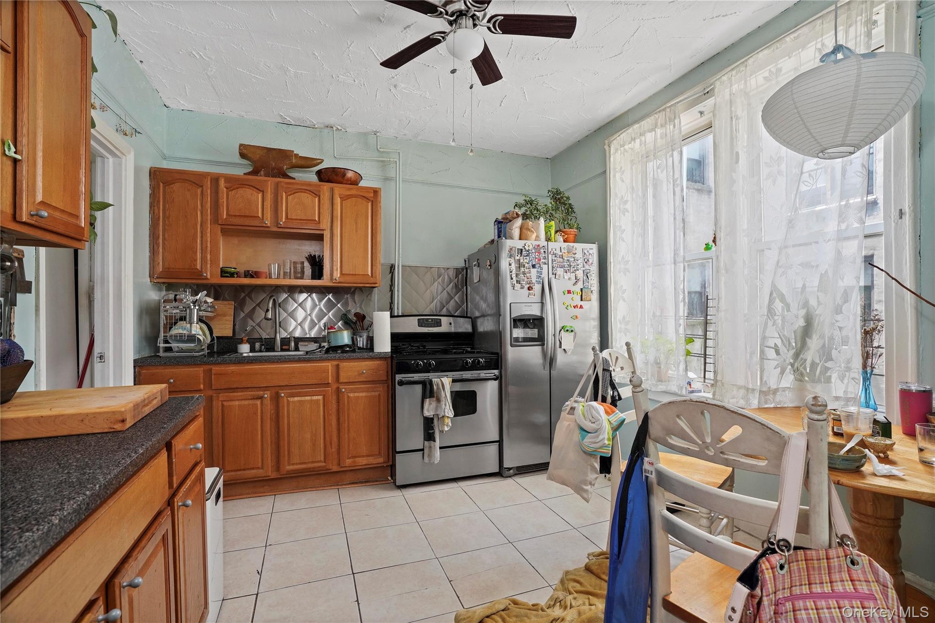 - Kitchen with stainless steel appliances, brown cabinetry, backsplash, a ceiling fan, and light tile patterned flooring