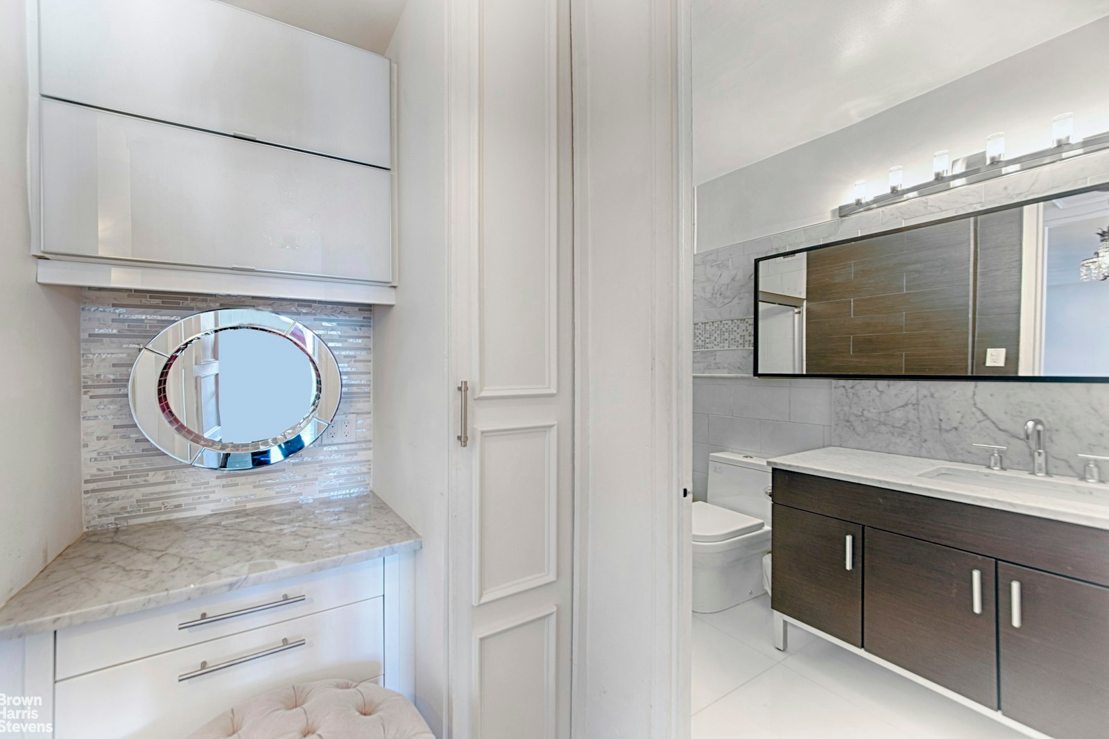 The king-sized primary bedroom offers room to relax and unwind with plenty of space for additional furnishings. The spa-like bathroom is appointed with custom stone tiles and marble finishes. Additional highlights include, private terrace with dramatic city and river views. Deep closets and custom built-ins and hardwood floors throughout. Designer lighting and a separate bar with stainless steel wine refrigerator