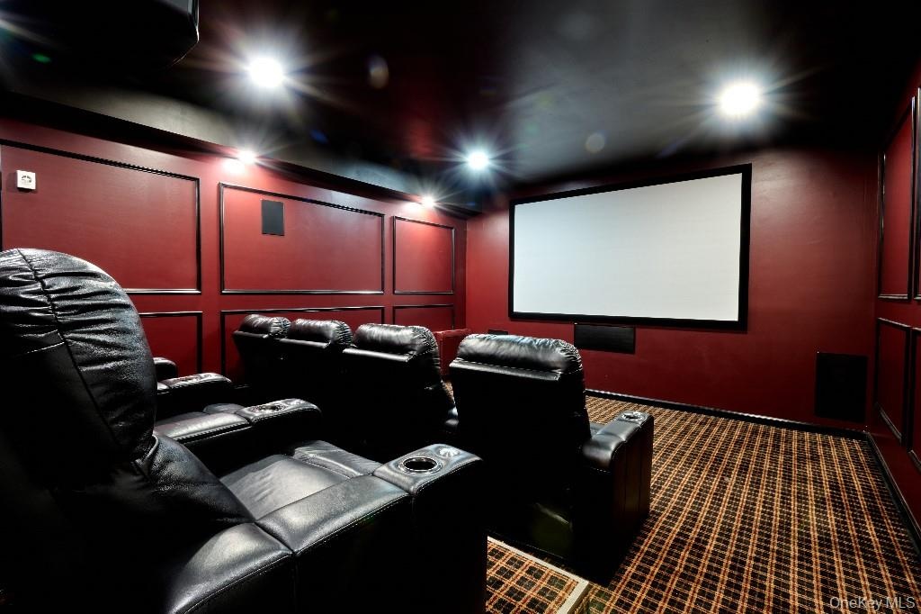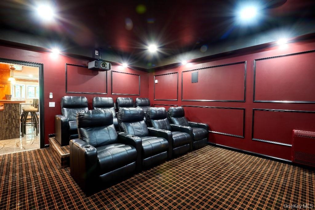 - Carpeted home theater room with recessed lighting and a decorative wall