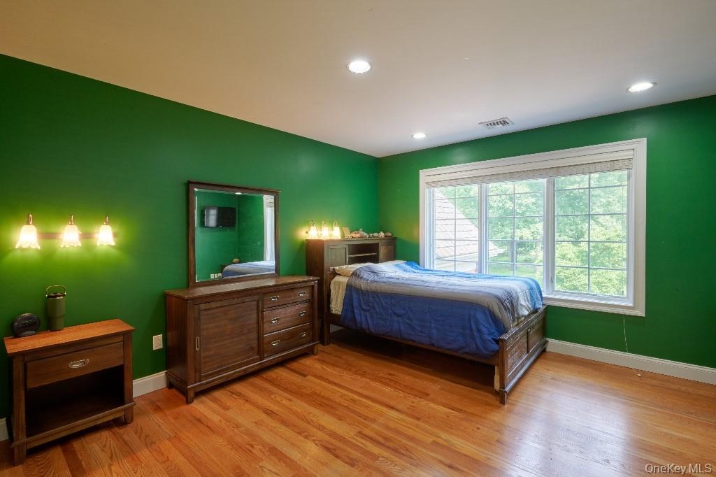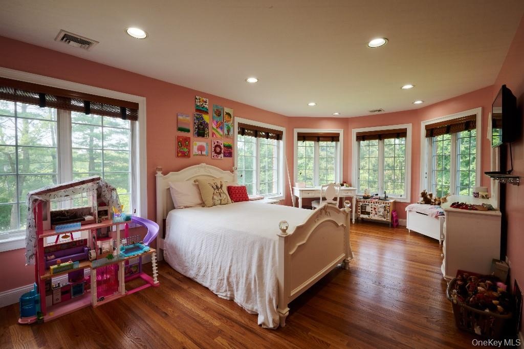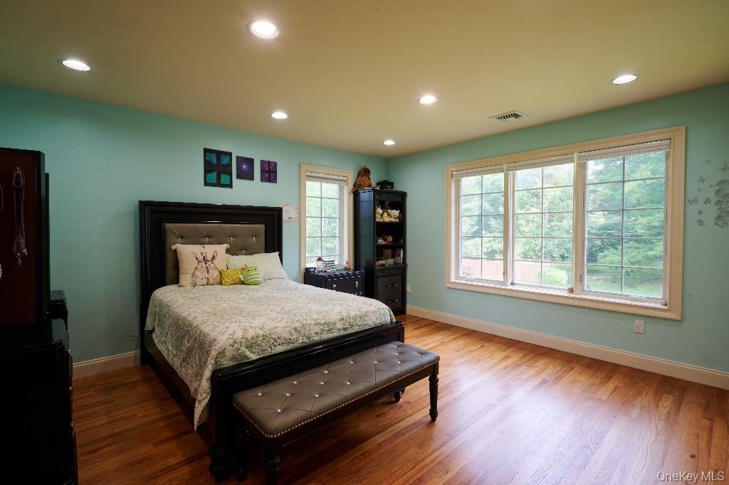 - Bedroom with multiple windows, recessed lighting, and dark wood-type flooring