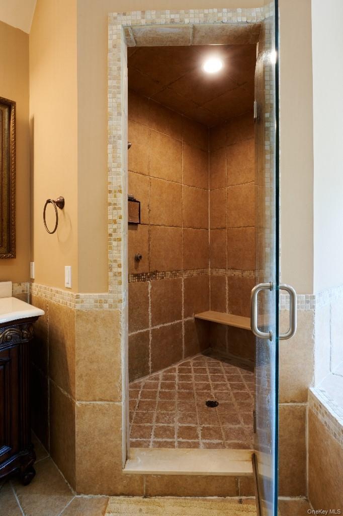 - Bathroom with a shower stall, vanity, tile walls, recessed lighting, and wainscoting