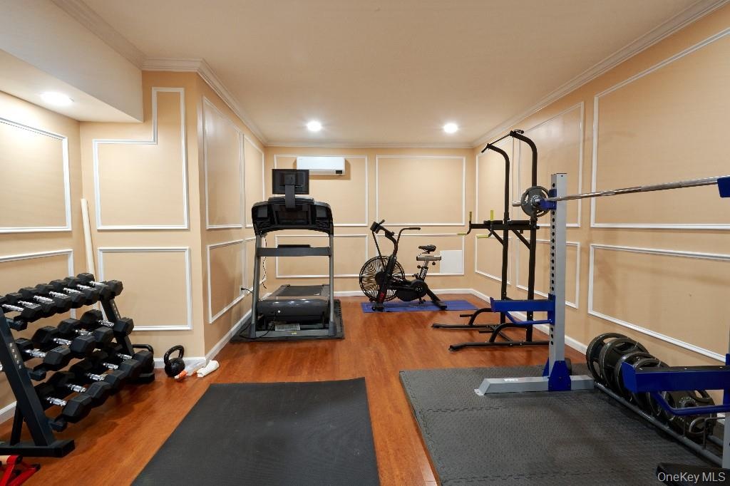 - Workout room featuring a decorative wall, crown molding, wood finished floors, recessed lighting, and an AC wall unit