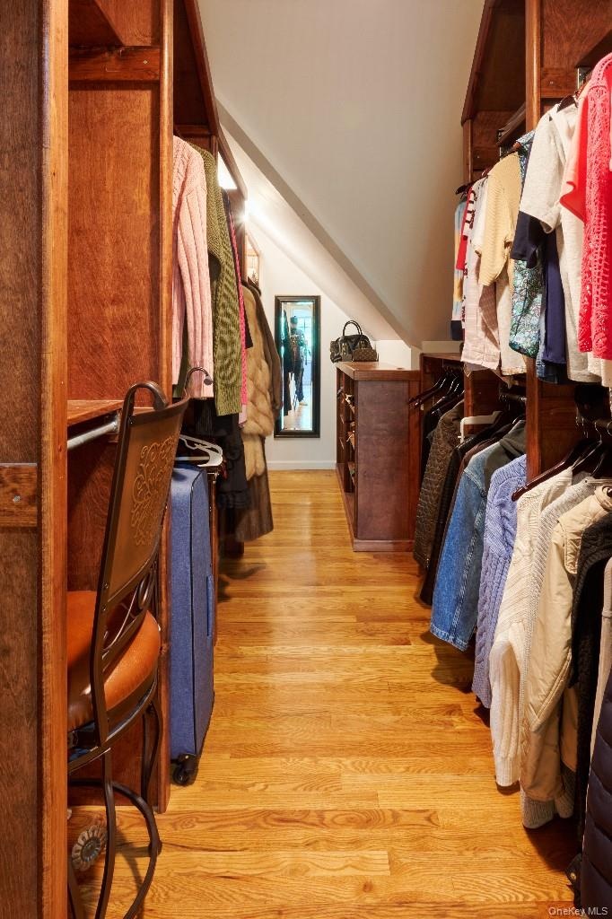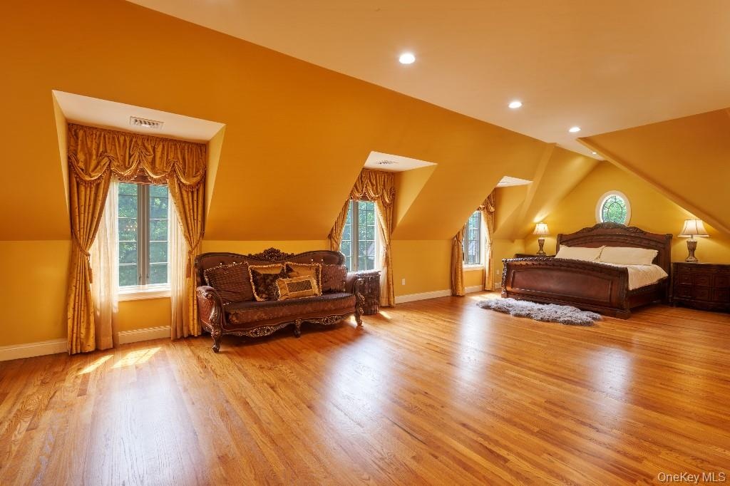 - Bedroom featuring multiple windows, wood finished floors, and vaulted ceiling