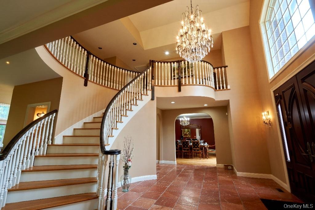 - Entrance foyer with a chandelier, a towering ceiling, stairs, arched walkways, and recessed lighting