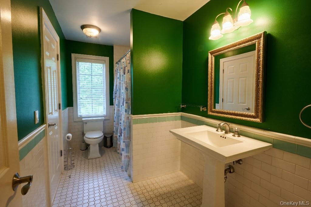 - Full bathroom with tile walls, a wainscoted wall, tile patterned flooring, and a shower with curtain