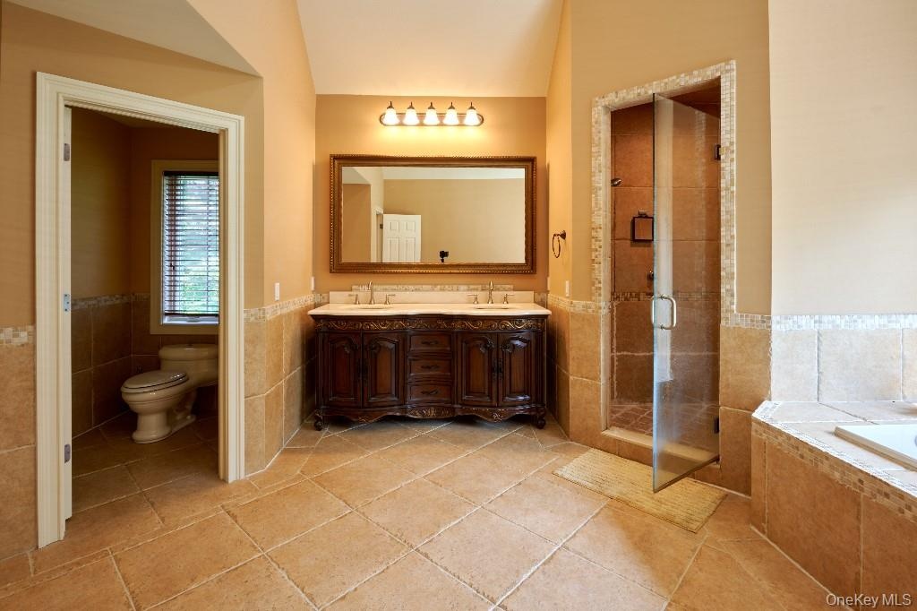 - Full bathroom with tile walls, double vanity, a wainscoted wall, a bath, and a shower stall