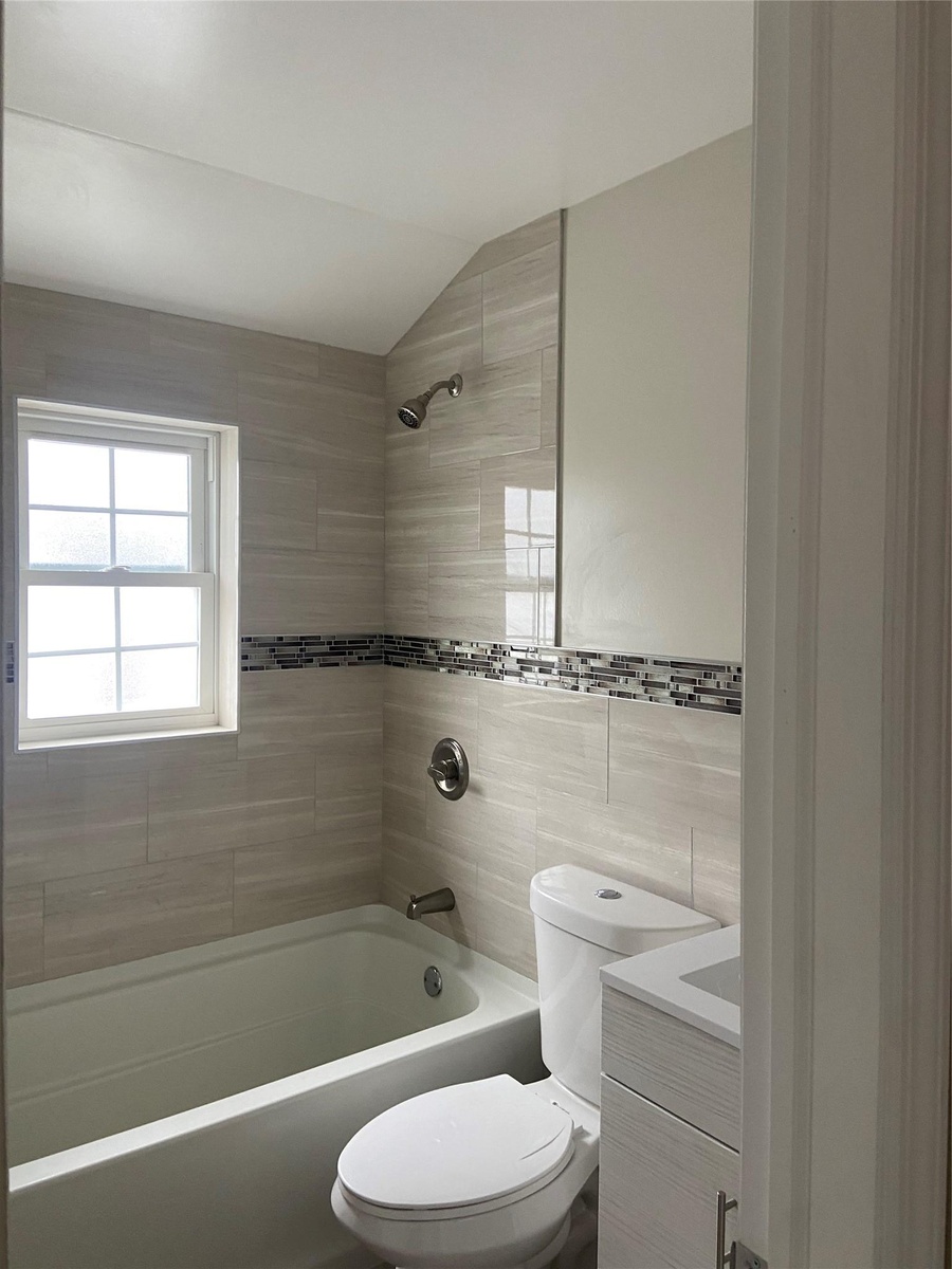 - Bathroom featuring tub / shower combination, vanity, tile walls, and vaulted ceiling