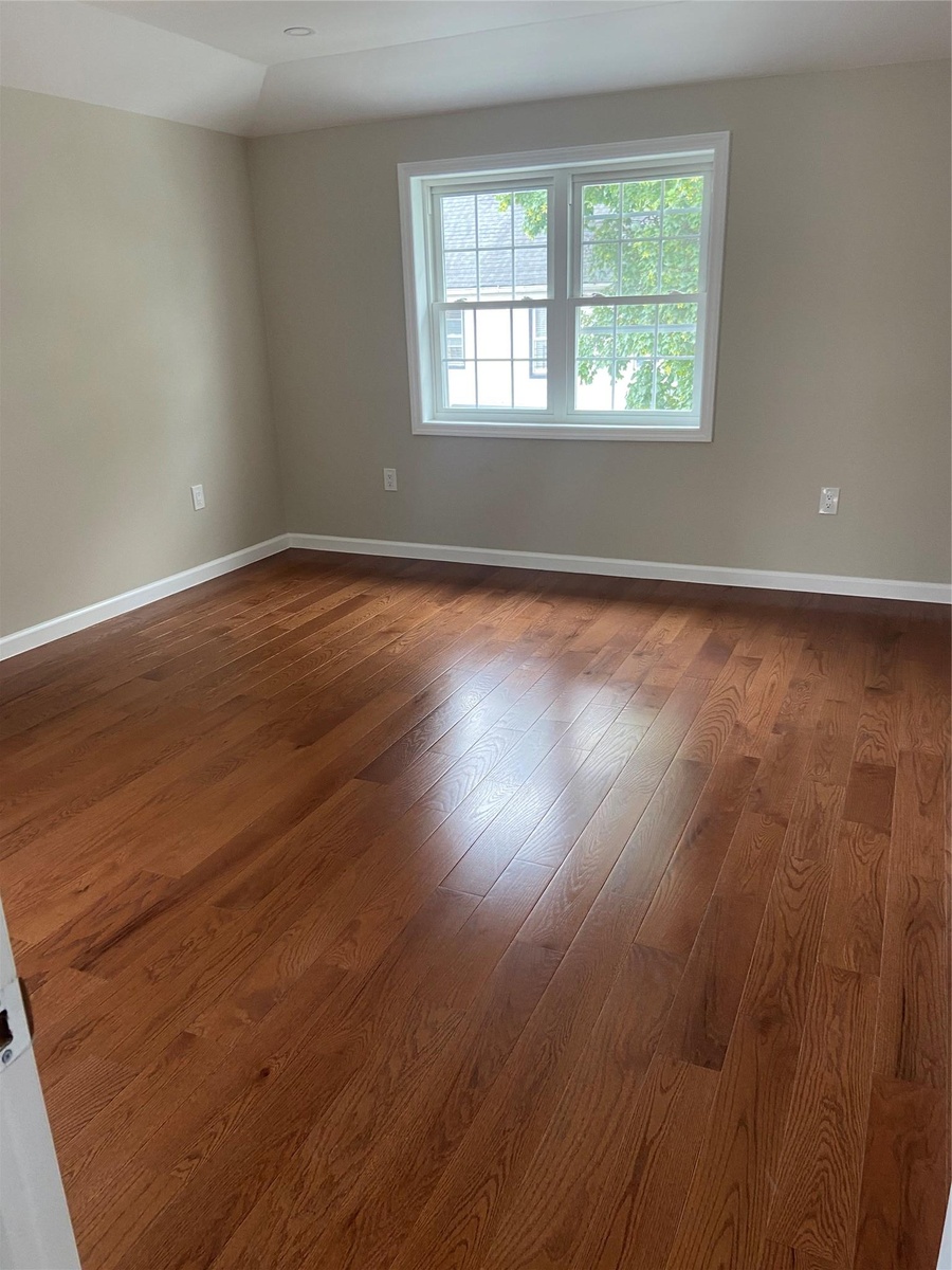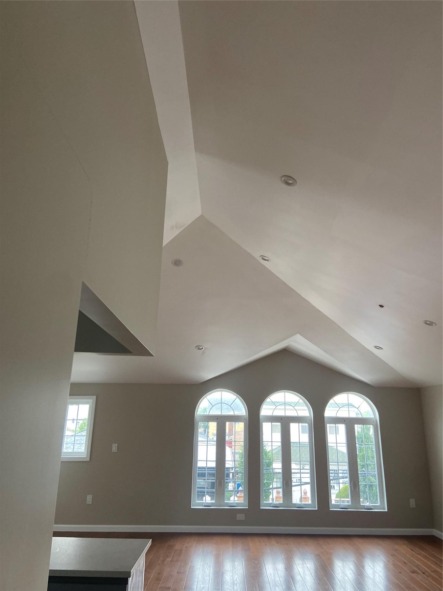 - Unfurnished living room featuring dark wood-style floors and vaulted ceiling