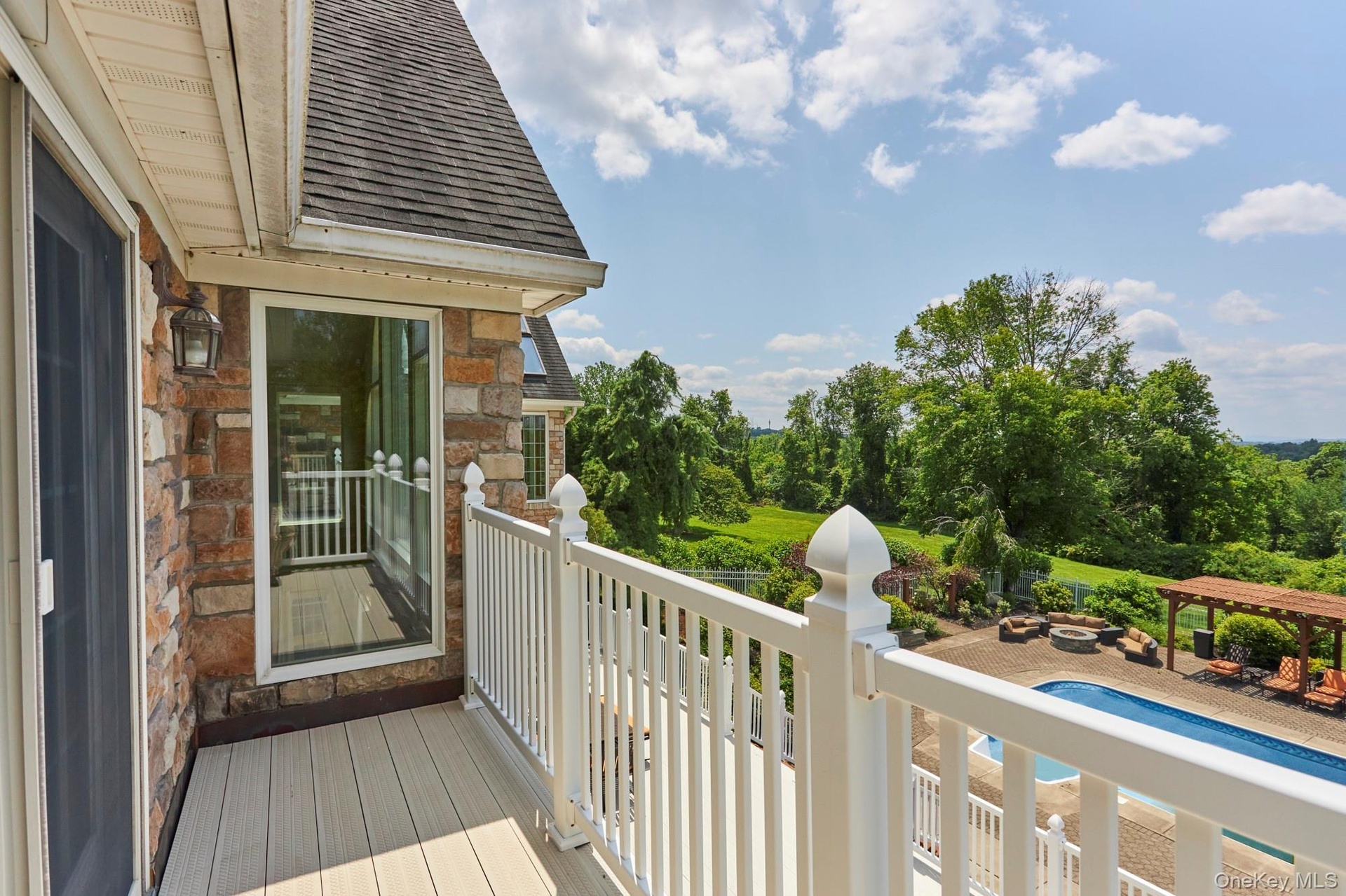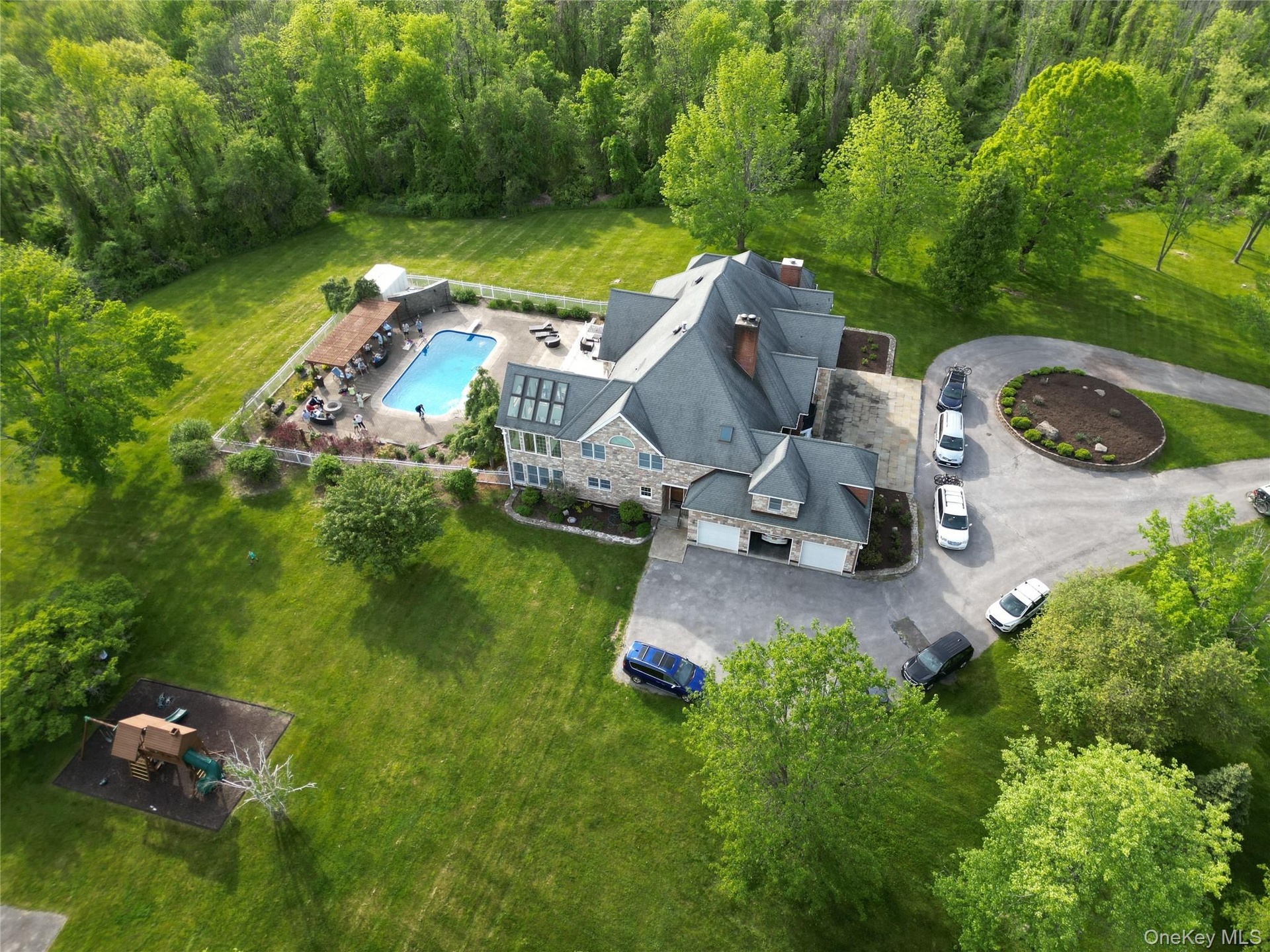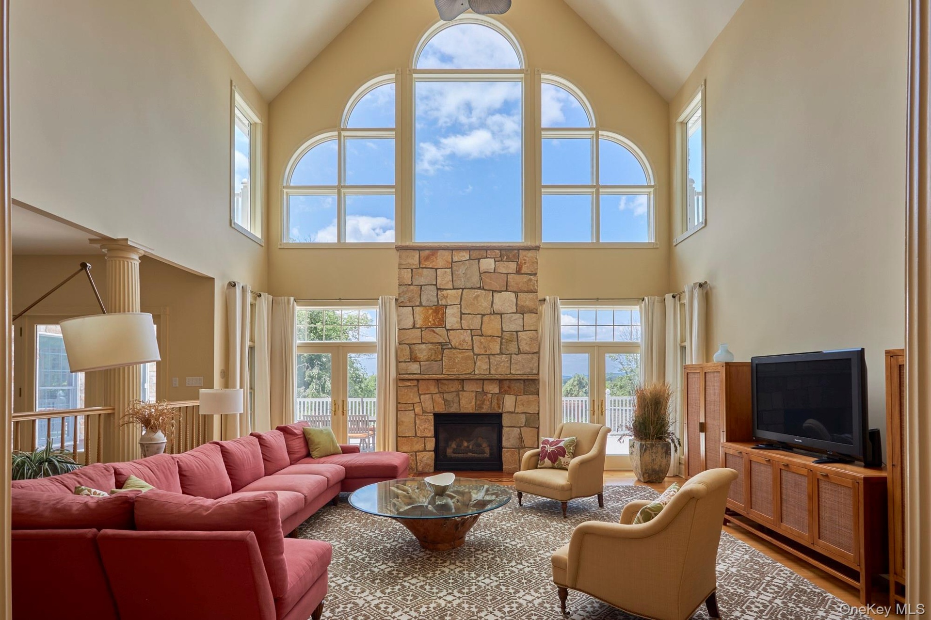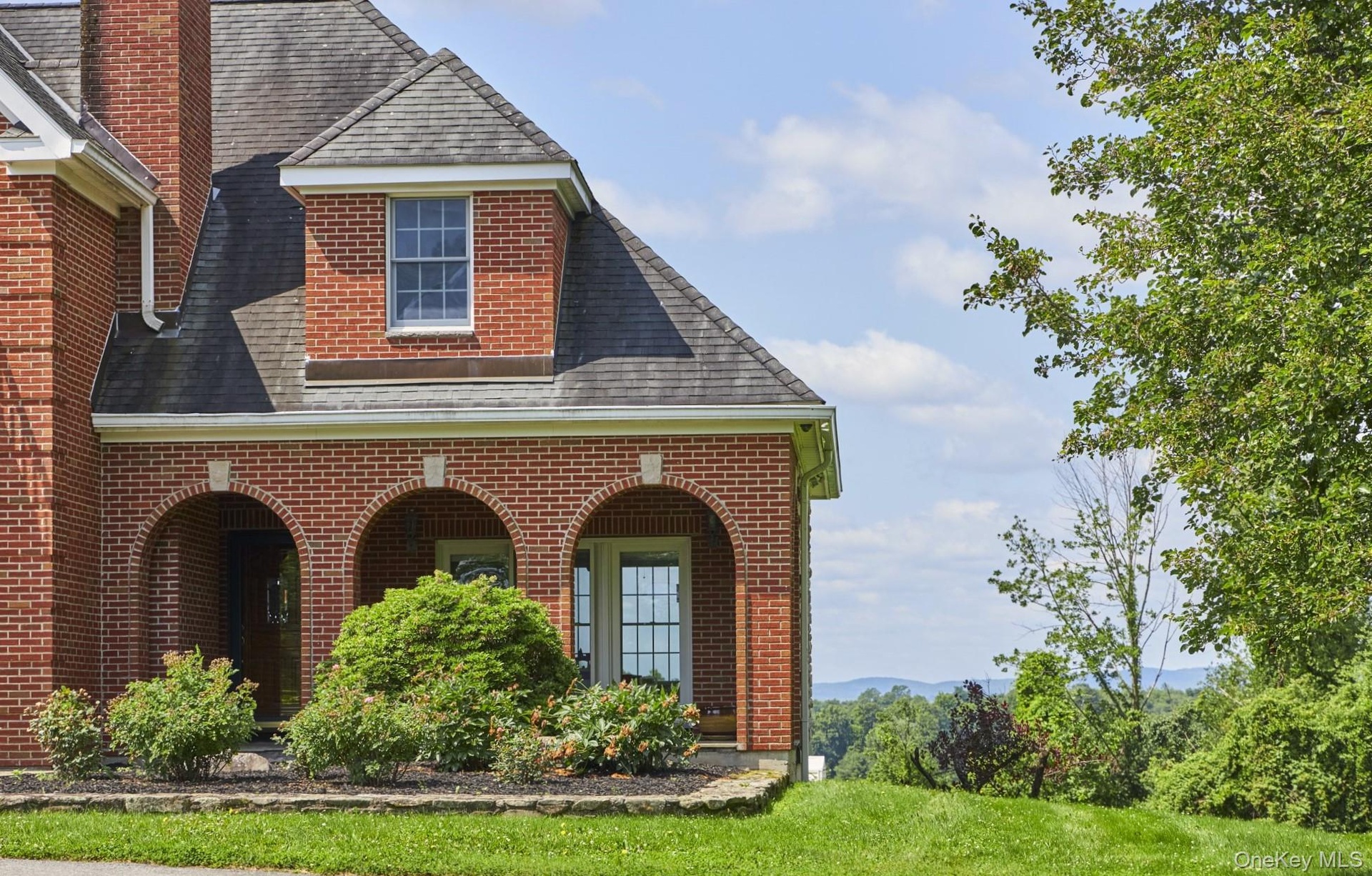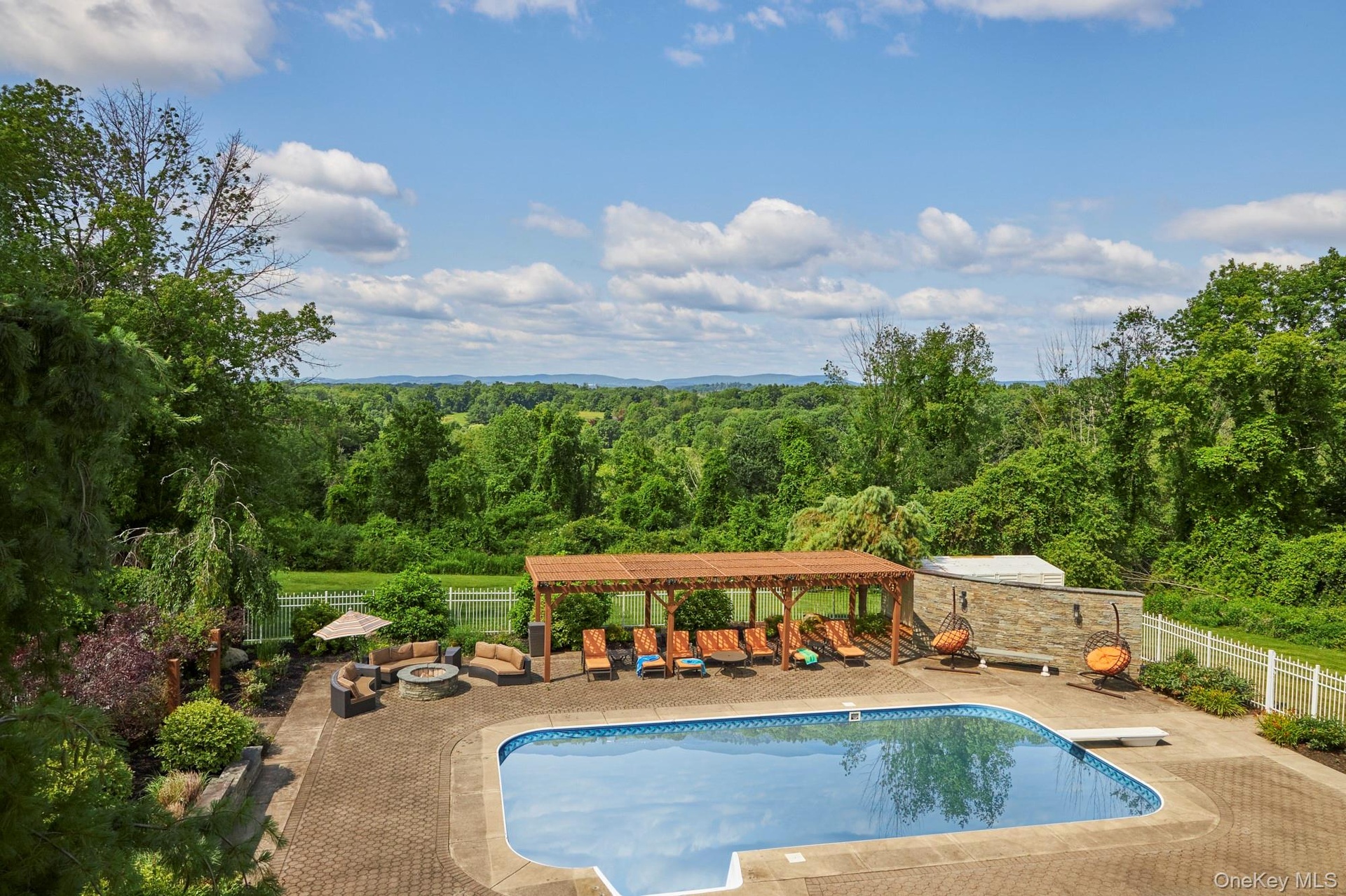 Hilltop Retreat, built in the Millenium Mansion style, provides an incomparable experience of country living. This gracious residence is approached via a meandering driveway past stone walls and a pond and is secluded within 66 acres of curated lawns w/ majestic trees, a shimmering pond, old growth forest, and year-round Catskill mountain views. Casually formal, w/over 7,000sqft of living space spanning 3 levels, this home affords plenty of space for an abundance of shared enjoyment as well as personal serenity. Throughout, the gleaming wood floors, tall windows, and high ceilings capture beautiful light. The bluestone entry off the circular drive leads into a foyer w/a sweeping 3-story staircase where you’re drawn into the vast double height living room centered around a stone fireplace and French doors opening into the full span of western views and expansive poolside living. Flanking the foyer are the library and formal dining room, each w/ large window seats, fireplaces, and inlaid wood floors. The u-shape eat-in kitchen is anchored by a large central island and opens into a solarium, perfect for growing culinary herbs and flowers. On the far side of this floor is a most special room w/ 3 sides of glass and doors which open into an arched portico. Up the beautiful, curved staircase onto an expansive landing overlooking the living room and out to the mountains. The primary bedroom suite is quite dramatic w/ a sitting area, two-sided marble fireplace and balcony. The dressing room has 2 built-in closets and the bathing area pampers. Three additional ensuite bedrooms w/ dressing rooms complete this floor. The lower level is about fun. Enter into the recreation room – ping pong/pool table, games, darts, a wet bar, and a major gym w/ a full bath. Here also are two additional quite ample rooms (bed, study, den?) and a bath. The picturesque landscape is seen and is accessible from almost every room. Walk down the sweeping lawn, past the wishing well, and into the fenced irrigated garden w/ fruit trees, blueberry bushes, strawberry beds, and room for more. The children’s playground is sweet and adjacent to the lighted basketball court. Further on is the aerated pond w/a seating dock w/electric – fish, canoe, sleep. And, the pool: Heated, 800sqft surrounded by a sprawling patio w/a beautiful pergola, massive peony gardens, a firepit and steps leading to the 875sqft upper story deck. This retreat, majestically sited on this property, is a refuge and park in all seasons. Located in the Town of Poughkeepsie, only 81 miles from Midtown, 5 miles to MetroNorth RR & 2.5 miles to Adams Fairacre Farms for all your provisions. This country estate offers the gift of both visual and sonic seclusion without the need to travel too far.