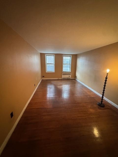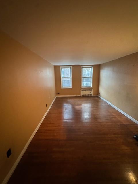 - Unfurnished room featuring dark wood-style flooring and radiator