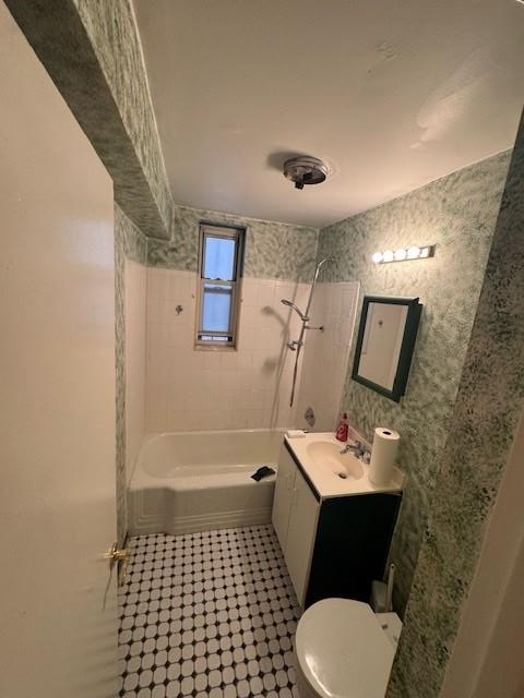- Full bathroom with wallpapered walls, vanity, and shower / bathtub combination