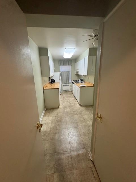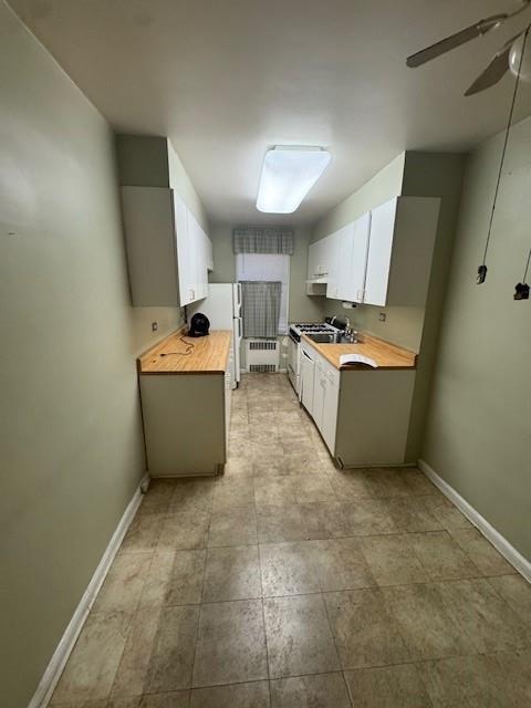 - Kitchen featuring butcher block counters, radiator heating unit, ceiling fan, white cabinetry, and stove