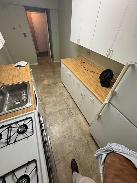 - Kitchen featuring fridge, white cabinetry, range, and light countertops