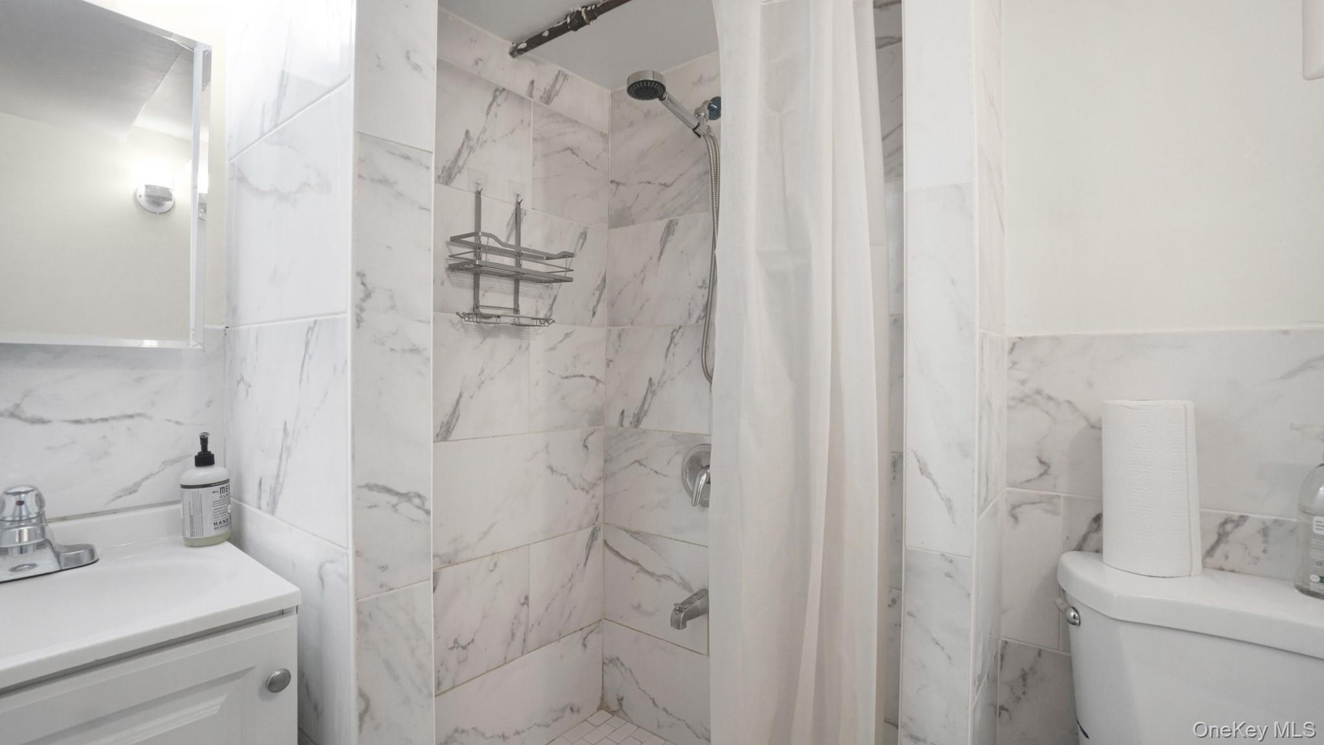 - Full bathroom with shower / bath combo with shower curtain and vanity