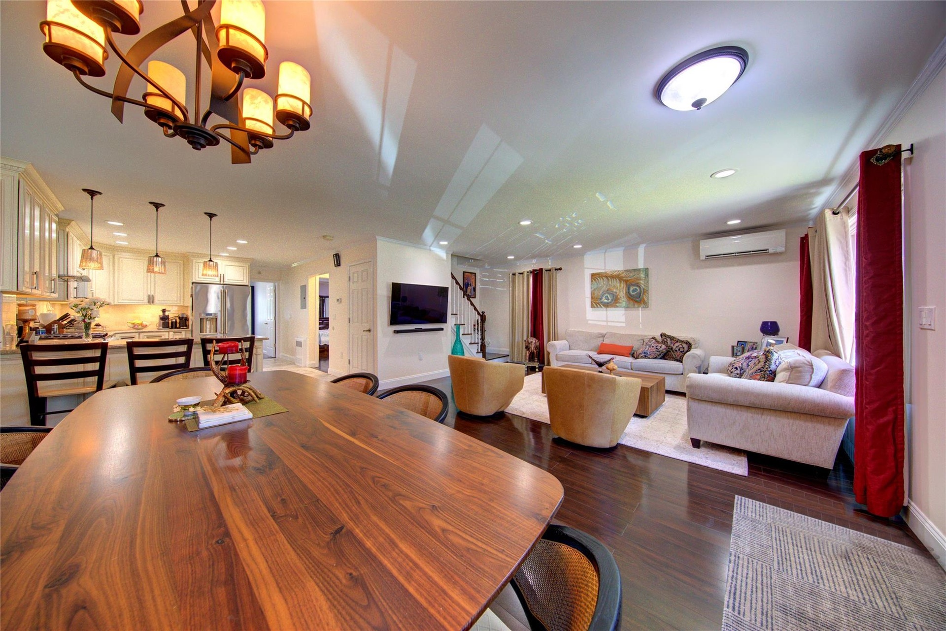 - Dining space featuring a wall mounted air conditioner, recessed lighting, dark wood finished floors, a chandelier, and stairway