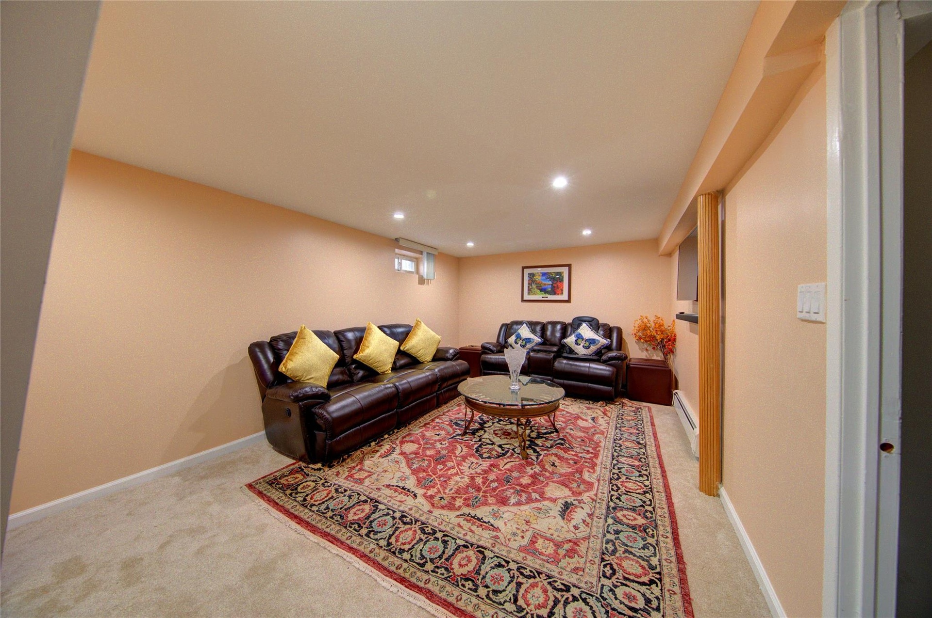 - Carpeted living room featuring recessed lighting and a baseboard heating unit