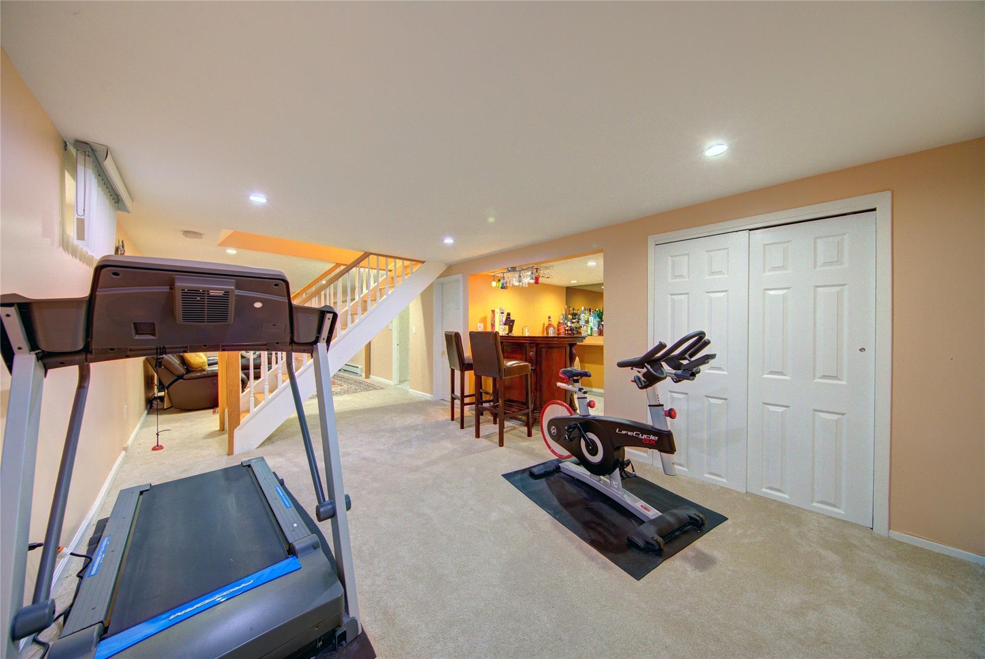 - Workout area featuring a dry bar, carpet floors, and recessed lighting