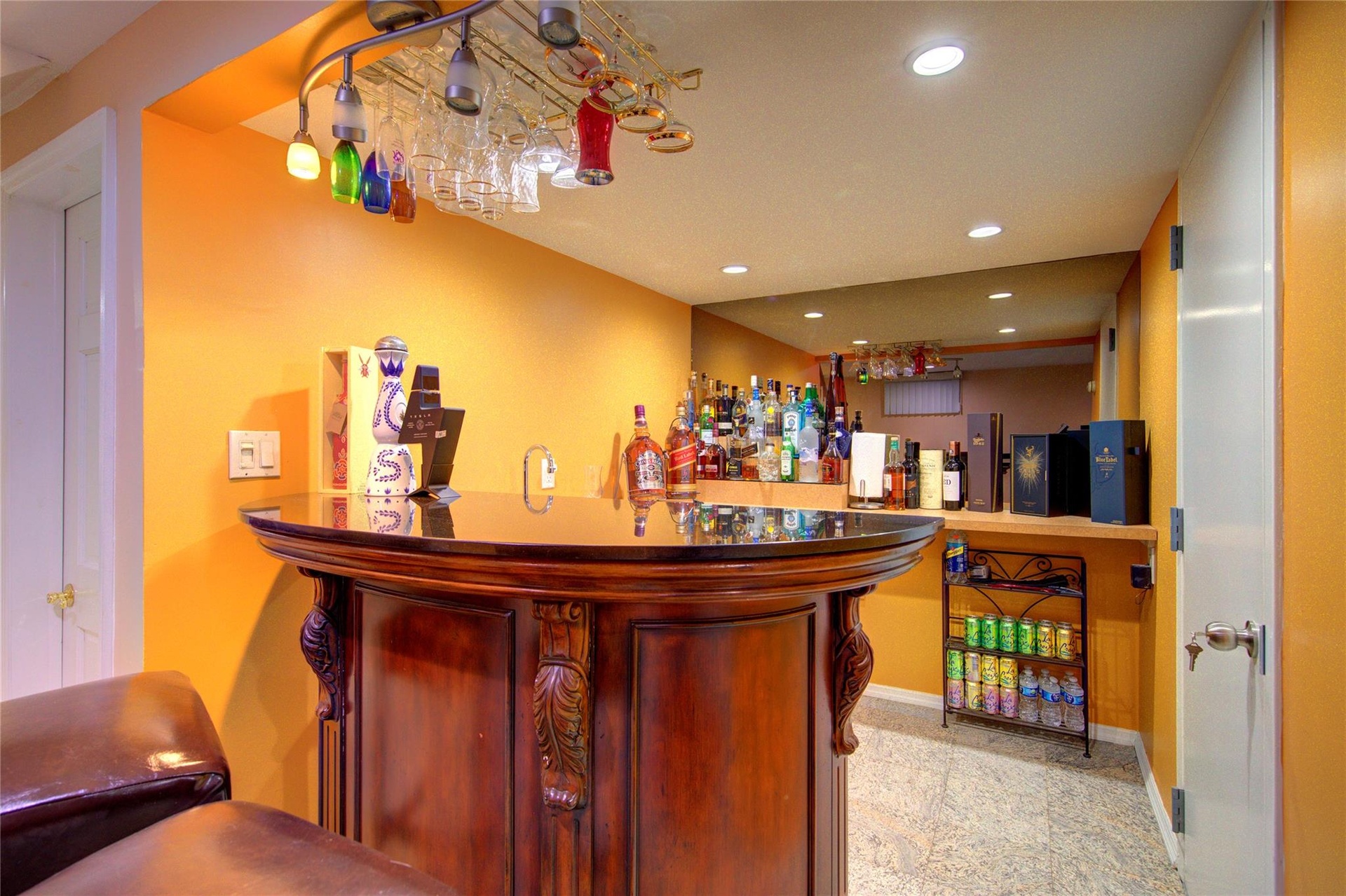 - Indoor dry bar with baseboards and recessed lighting