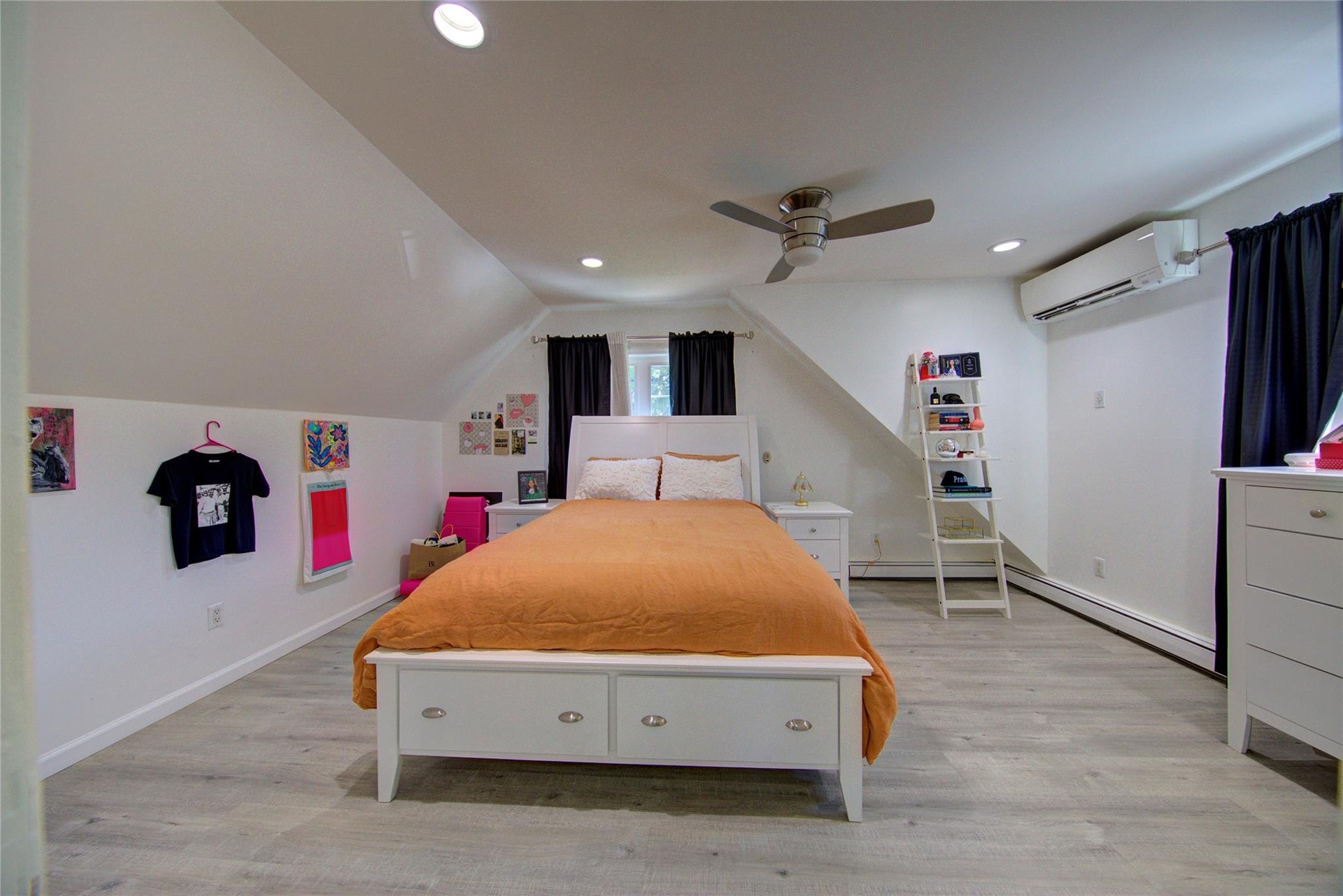 - Bedroom with dark wood-type flooring, a wall unit AC, ceiling fan, and recessed lighting