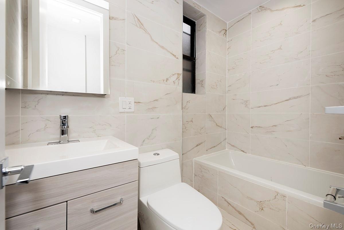 - Full bathroom with marble finish floors, tile walls, vanity, and a bathtub