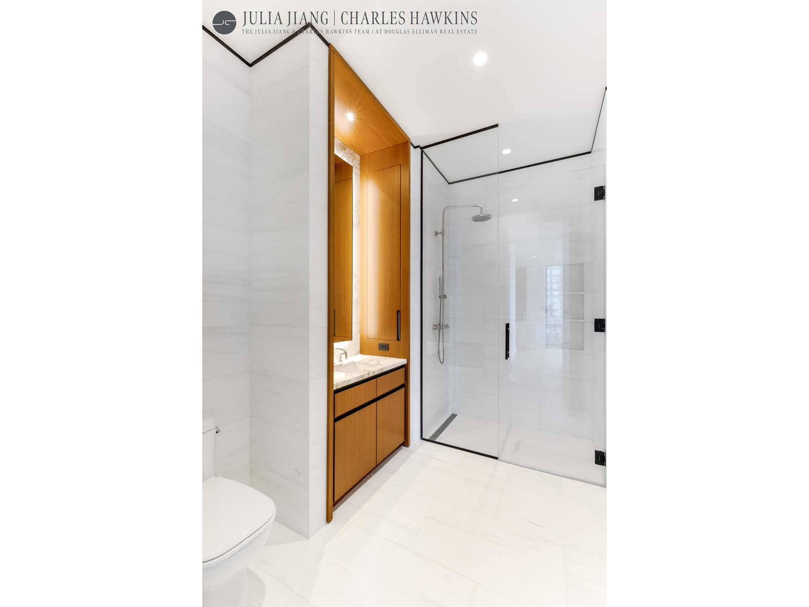 The oversized primary suite is a serene retreat, featuring floor-to-ceiling windows with unobstructed eastern river and city views. It easily accommodates a king-sized bed, with ample space for artwork and a dresser. The spa-like en-suite bath is clad in elegant Bianco Dolomiti marble and includes a large walk-in rainfall shower, heated floors, platinum fixtures, and generous storage.