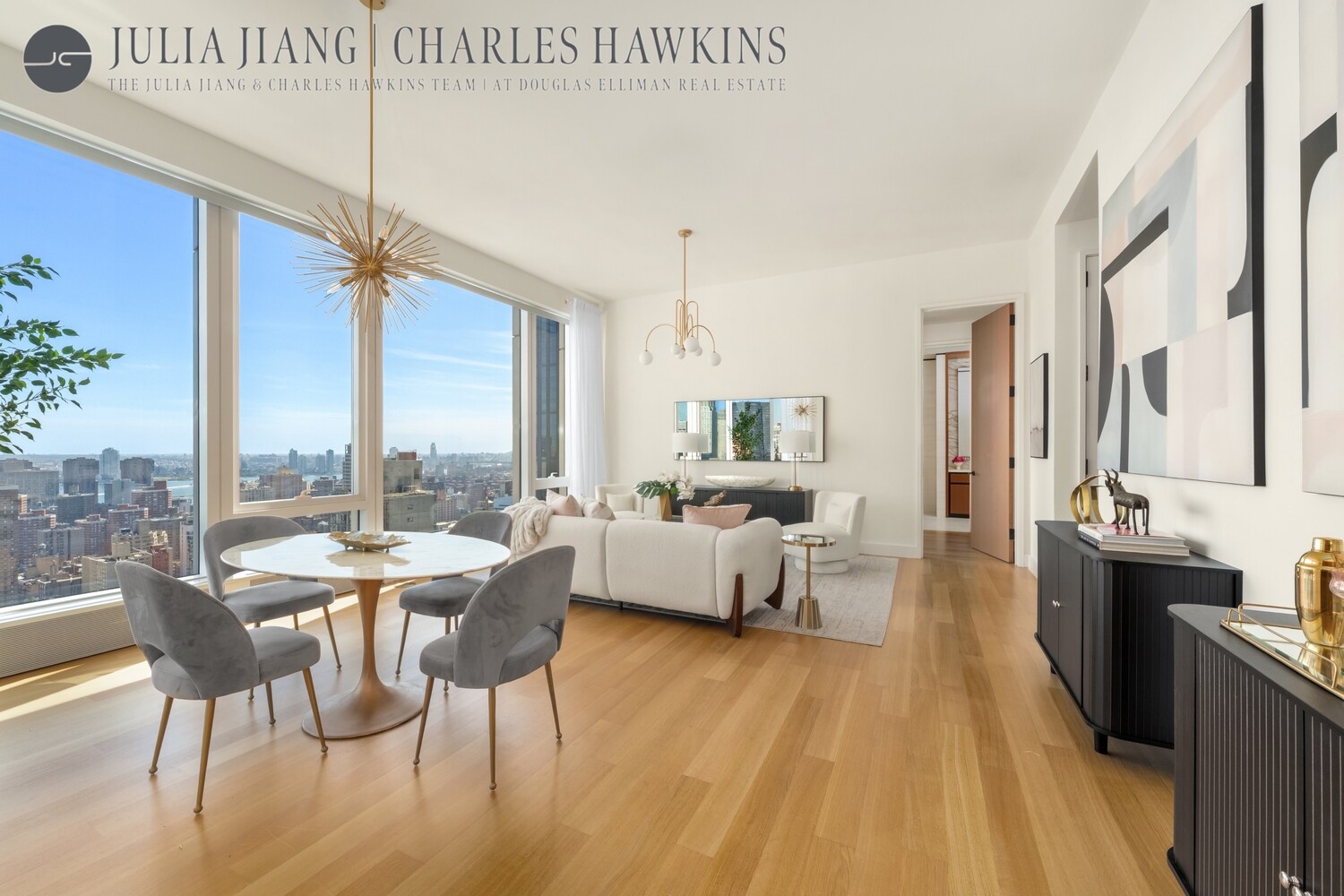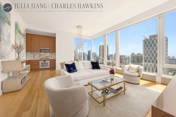 Perched high above NoMad, this sun-drenched corner unit features dramatic 11-foot floor-to-ceiling windows that frame panoramic skyline views to the North and East, including sweeping vistas of the East River.