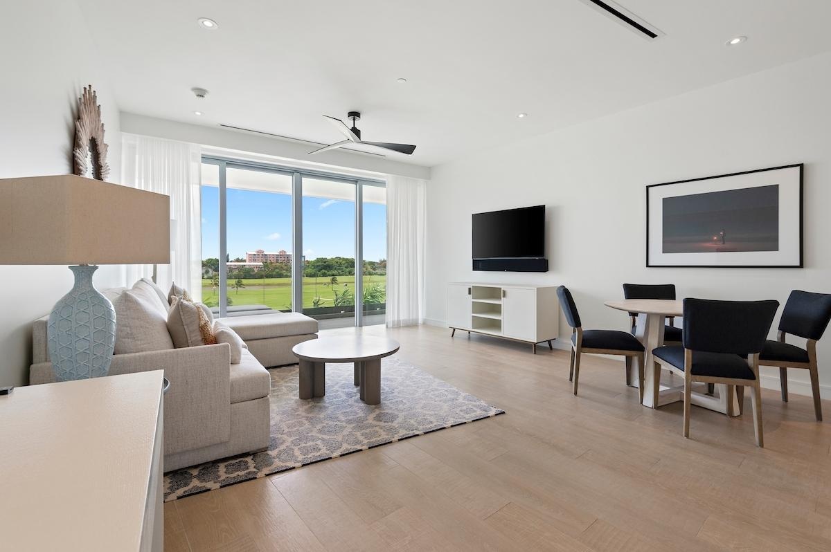 Enjoy luxurious island living in this 1,748 sq. ft. condo at Goldwynn Resort & Residences with stunning golf course views and abundant natural light from floor-to-ceiling windows. The modern kitchen features sleek cabinetry and quality appliances, flowing into the dining and living areas—perfect for entertaining. This home offers 2 spacious bedrooms and 2 bathrooms, including a master suite with a walk-in closet and spa-inspired bathroom with double vanity. Step onto your private balcony, accessible from the living room and master bedroom. This inviting space is perfect for relaxing, entertaining, or enjoying peaceful views of the lush Royal Blue Golf Course. Residents enjoy Goldwynn’s signature infinity pool, rooftop pool, fitness club, spa, dining options, and other amenities. Just a short walk to Baha Mar, Royal Blue Golf Course, and minutes from Lynden Pindling Airport and downtown Nassau, this condo blends elegance with convenience. Ideal as a full-time home, vacation retreat, or investment, this condo offers island elegance and modern comfort in Nassau’s premier community.