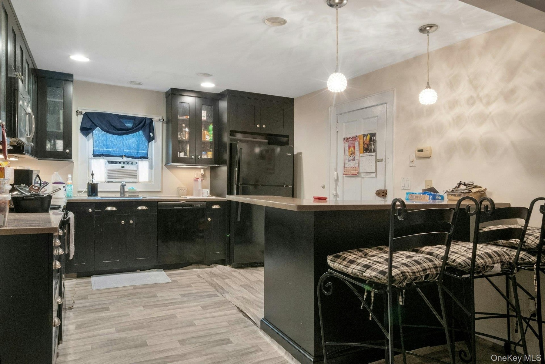 - Kitchen in main level unit featuring pendulum lighting, recessed lighting black appliances, dark cabinetry, a kitchen breakfast bar, granite counterto