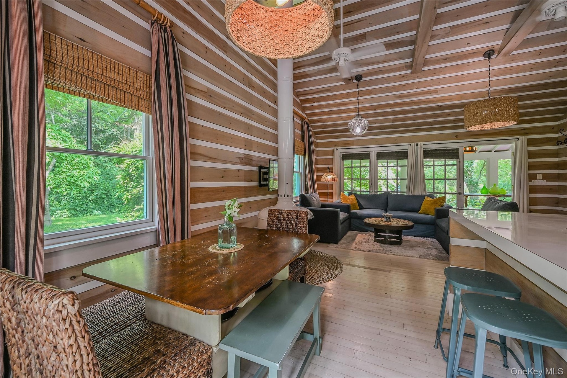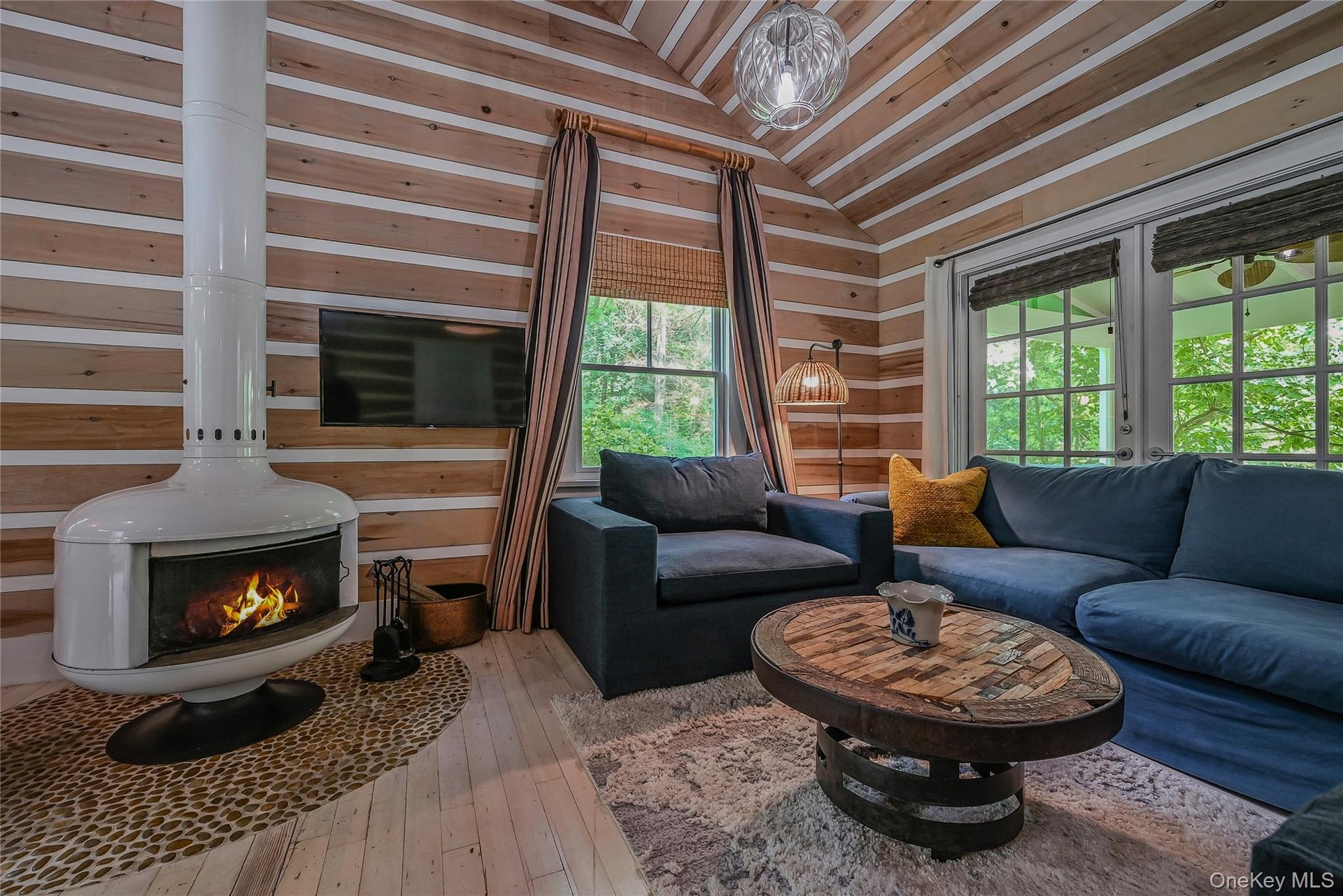 - Living room featuring wood walls, vaulted ceiling, plenty of natural light, hardwood / wood-style flooring, and a wood stove