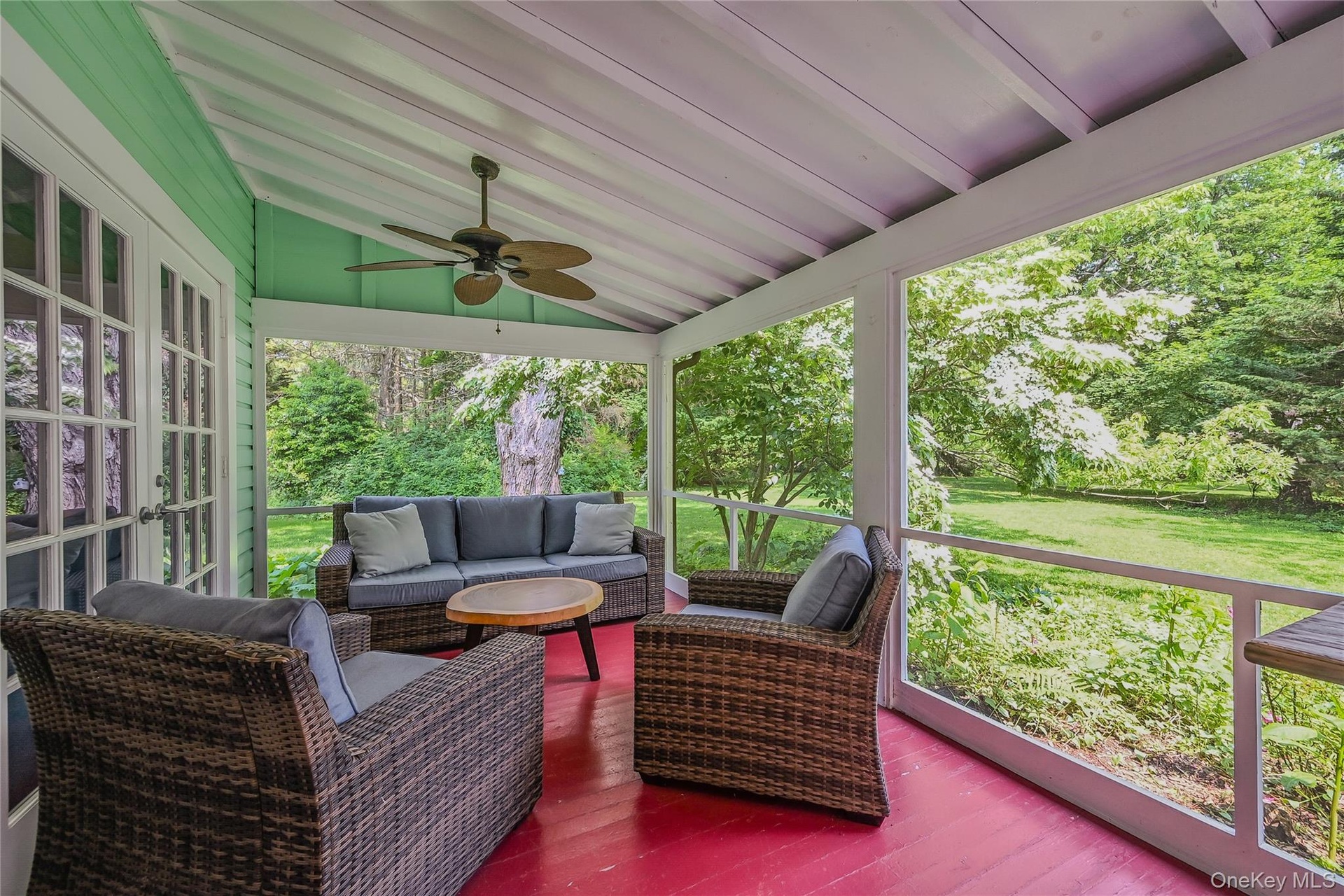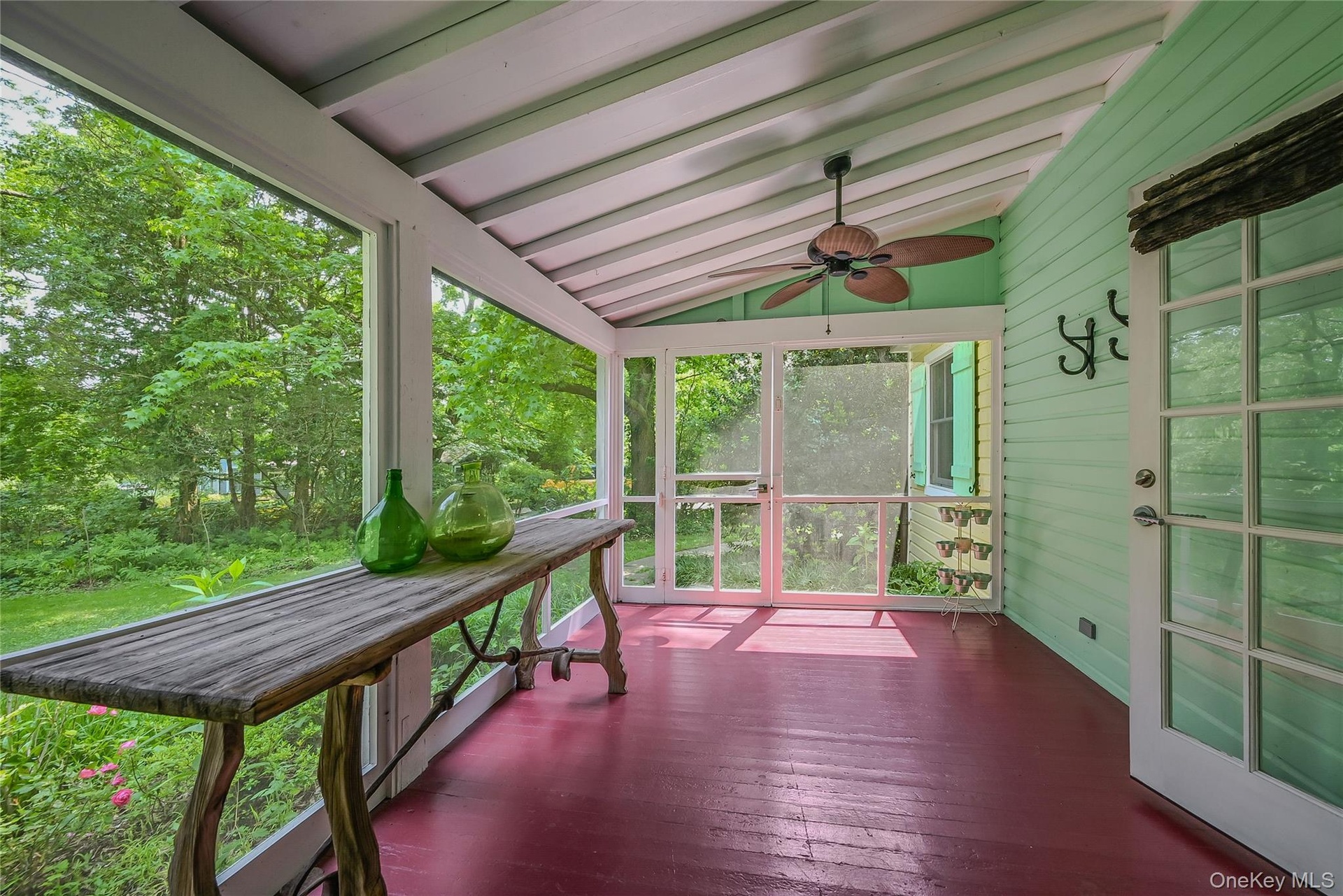 - Sunroom featuring a ceiling fan and healthy amount of natural light