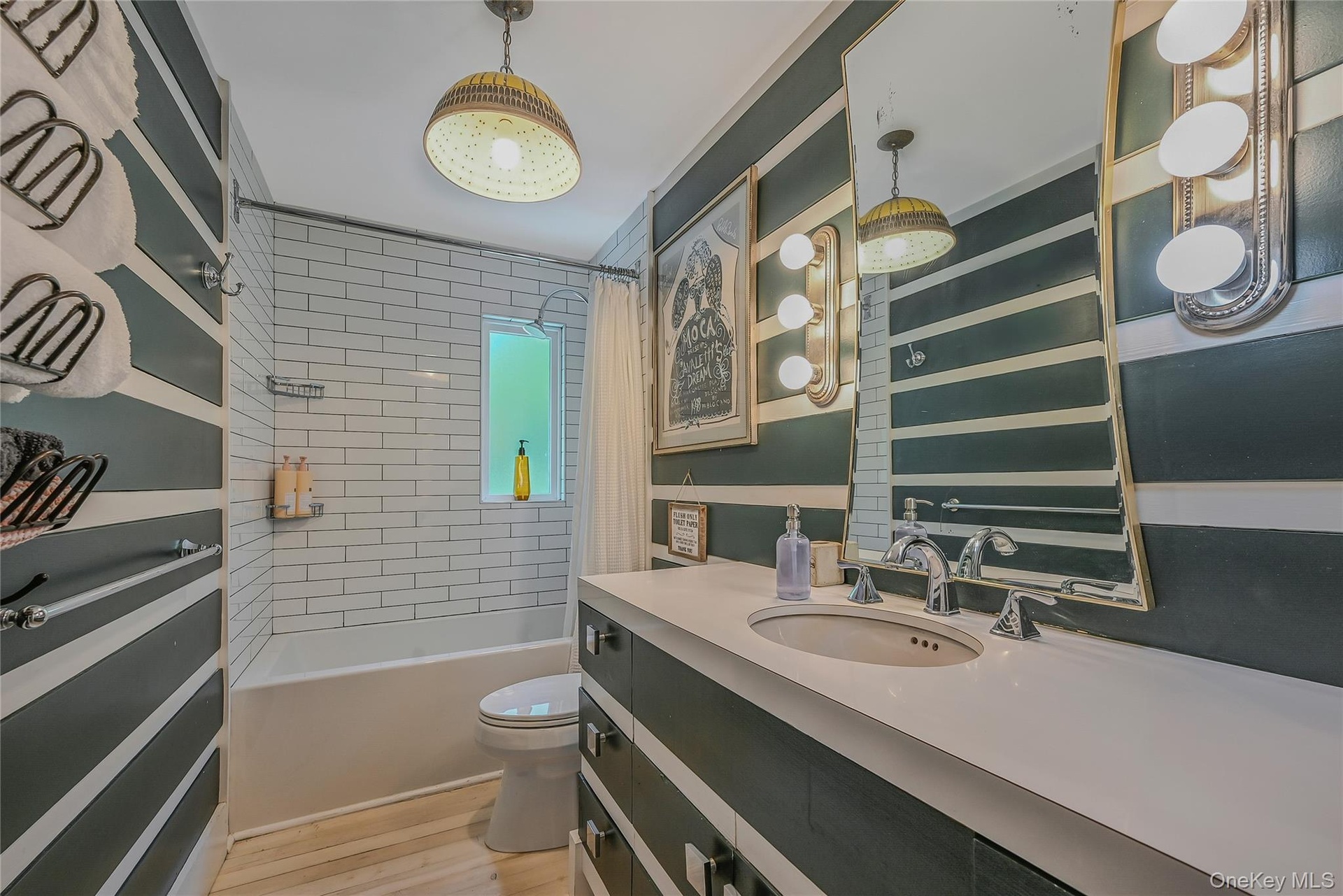 - Full bath with vanity, shower / tub combo, and wood finished floors