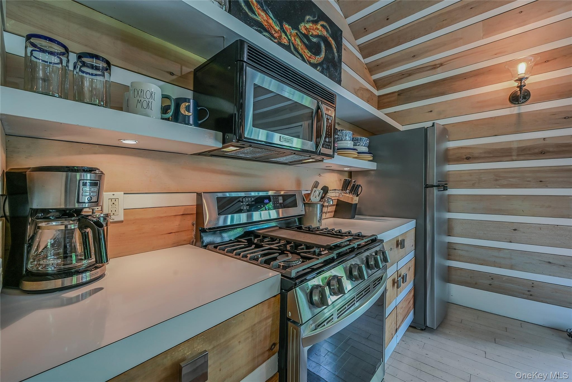 - Kitchen featuring stainless steel appliances, light wood finished floors, and wooden walls