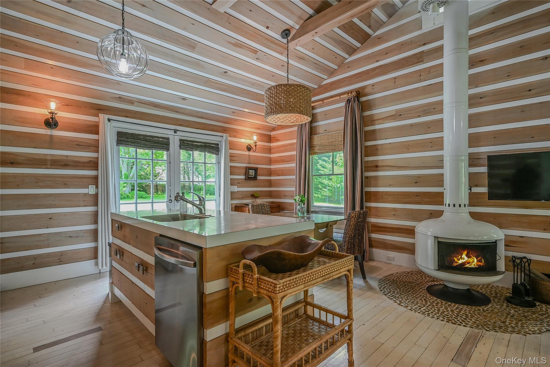 - Kitchen featuring dishwasher, wood walls, wood ceiling, wood-type flooring, and a kitchen island with sink