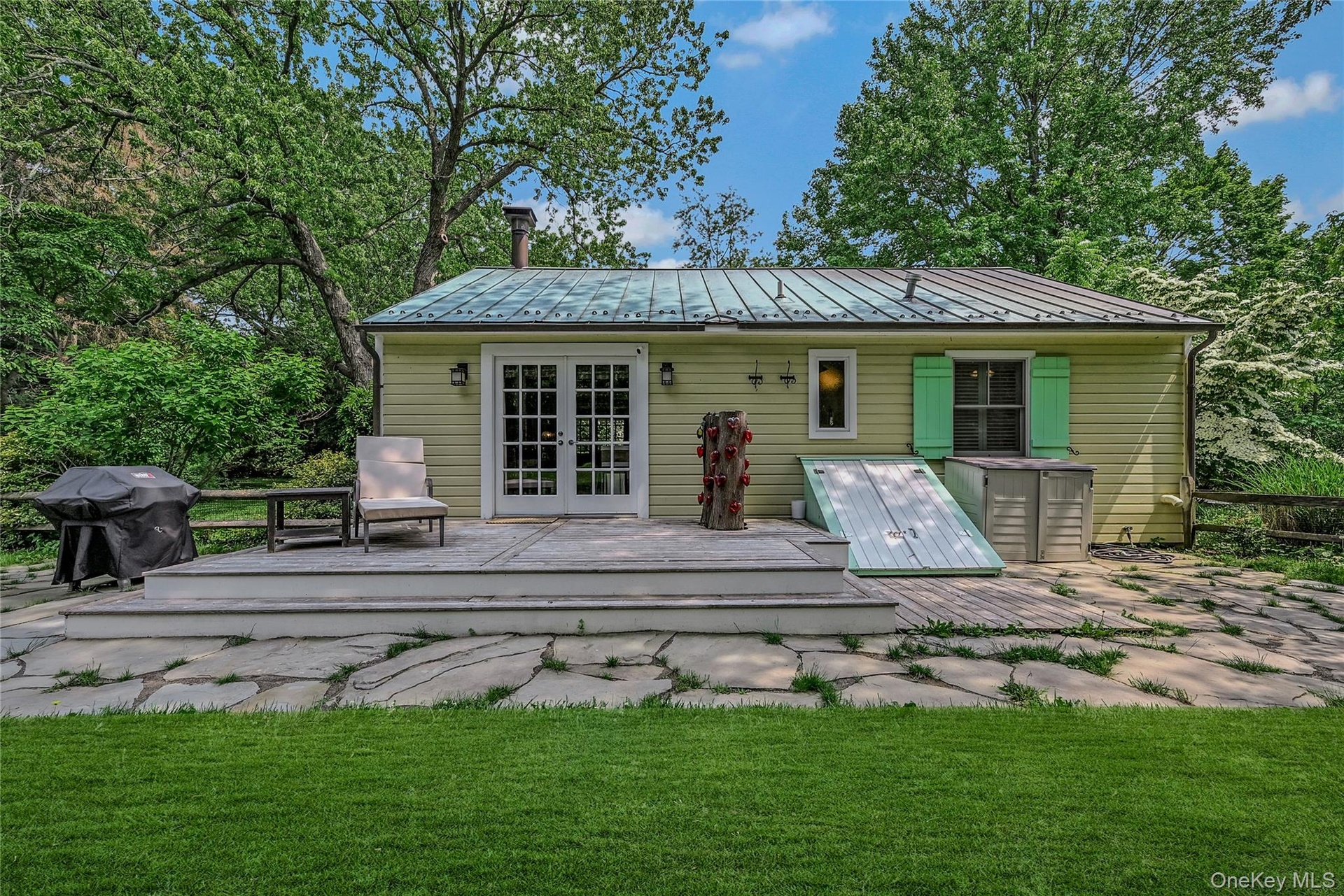 - Back of house with french doors, a standing seam roof, a deck, a metal roof, and a yard