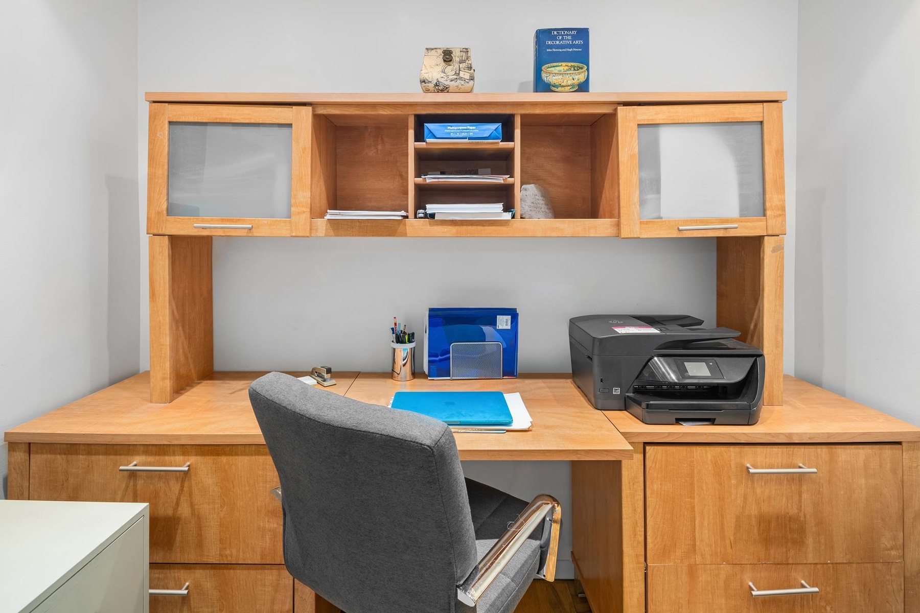 This fabulous apartment with totally flexible layout offers spacious rooms and the ability to use this layout in more than one way. Featuring an open kitchen with granite counters, two oversized split bedrooms, two renovated bathrooms with modern fixtures and upscale tiles, one with heated floors. There is a convenient home office with built-In shelving, and a wet bar with a wine cooler and refrigerator. The apartment was thoughtfully designed with comfort and funtionality in mind, featuring an abundance of closets and storage throughout.