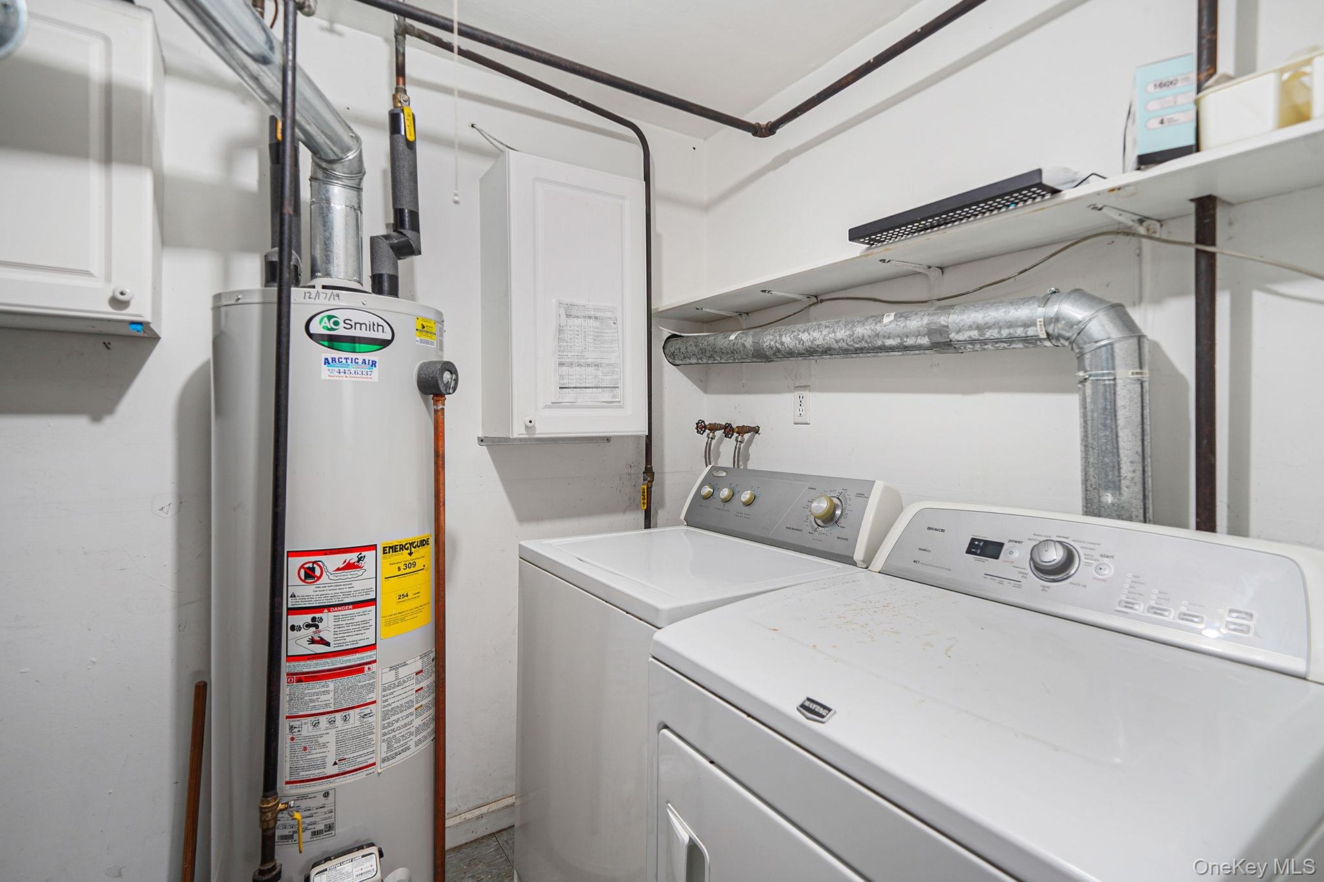 - Laundry area featuring gas water heater, washing machine and dryer, and cabinet space