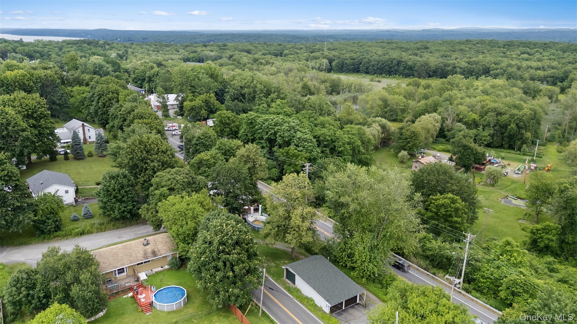 - Aerial view of a heavily wooded area and a large body of water