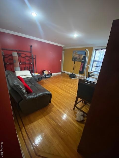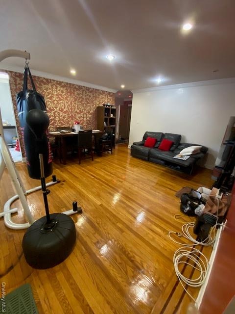 - Living room featuring crown molding and hardwood / wood-style flooring