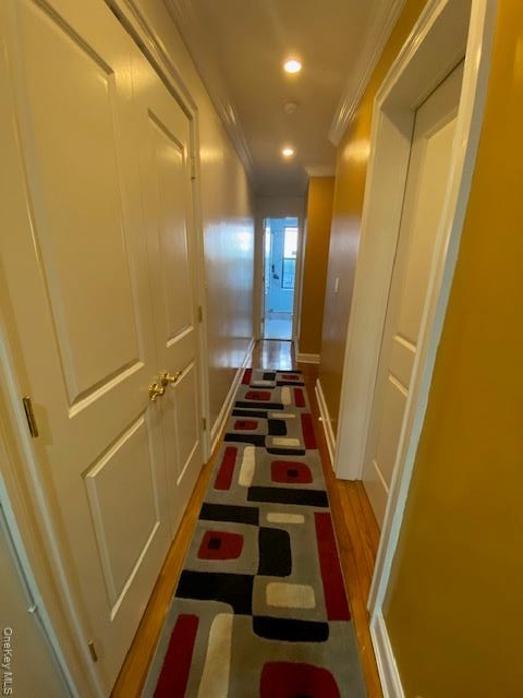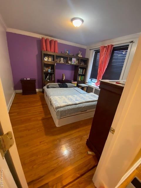 - Bedroom featuring hardwood / wood-style floors, a closet, and crown molding