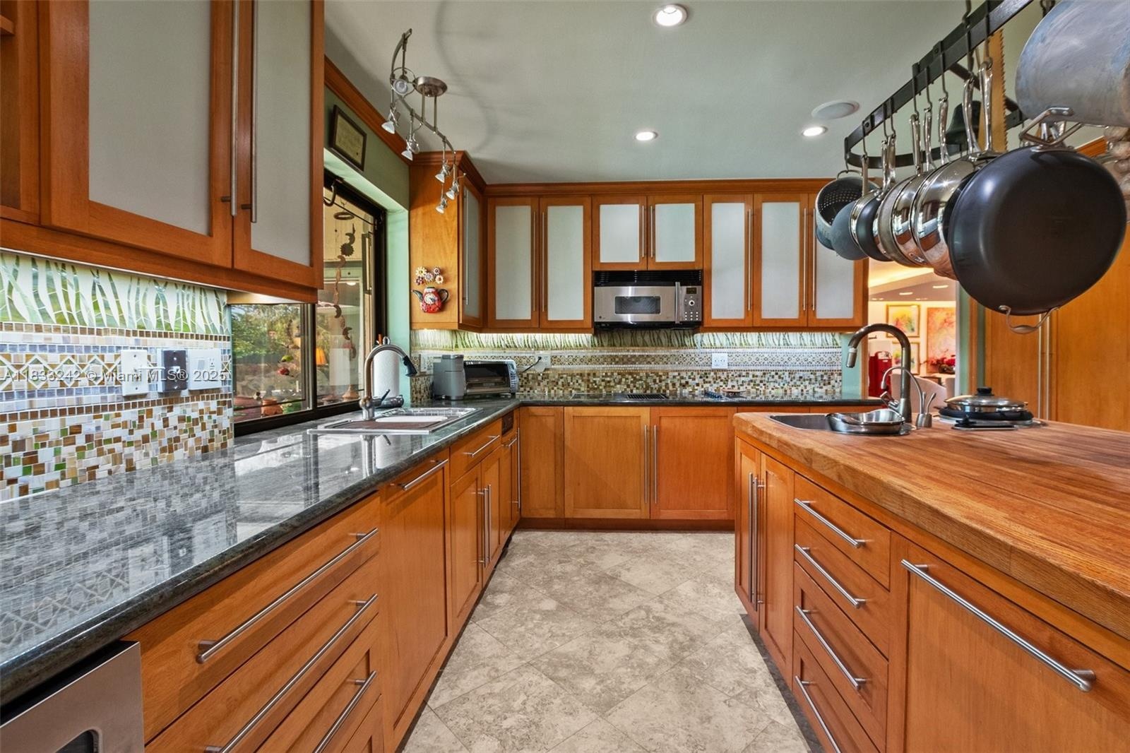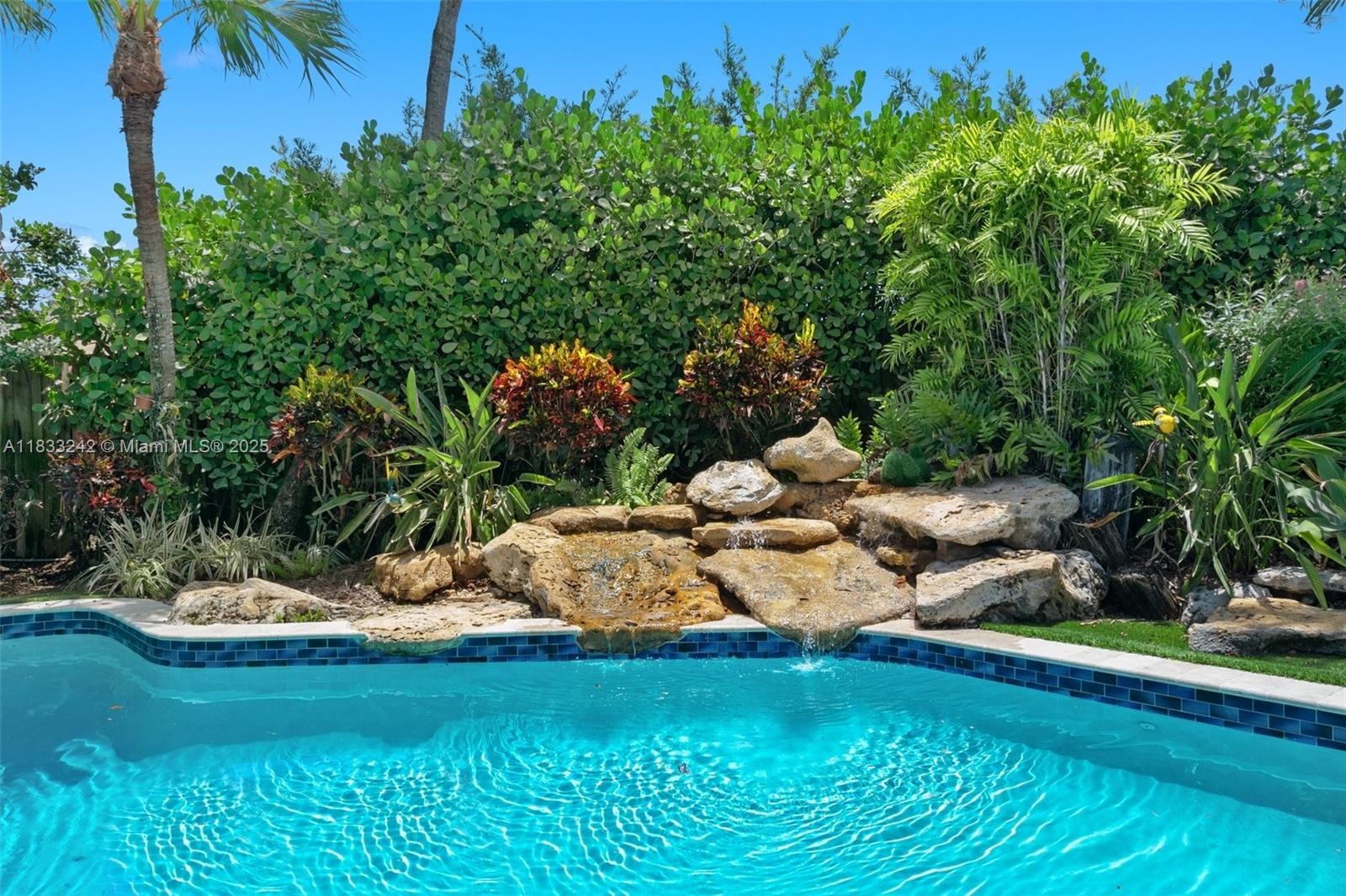 Beautifully updated 4BD/2BA home featuring marble floors in main areas and wood floors in all bedrooms. Gourmet kitchen with wood cabinetry, mosaic backsplash, granite counters, wine cooler, center island, and premium stainless appliances incl. oversized fridge, grill, and double oven. Primary suite offers walk-in closet, remote shades, and spa-like bath with steam shower, bidet, and Culligan system. Outdoor oasis boasts heated saltwater pool, spa, putting green, covered patio with TV, and 25 palm trees. A mix of hurricane doors, impact windows & shutters, tankless water heater, 5-ton A/C (2022), Nest system, and more. MOTIVATED SELLERS & a must-see!