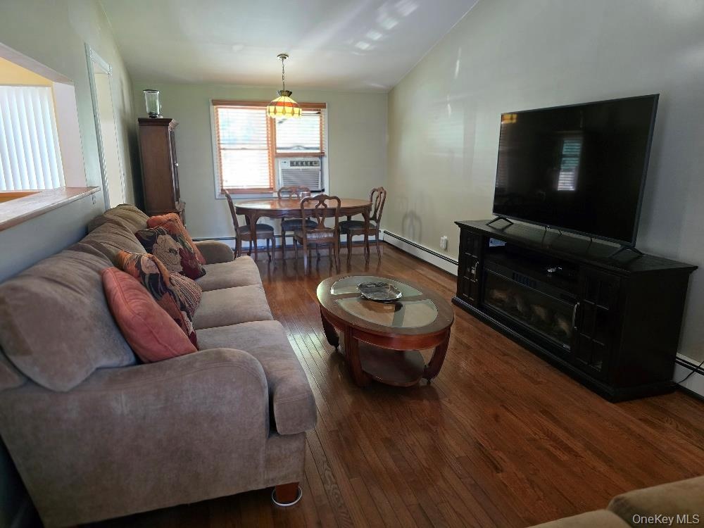 - Living room with vaulted ceiling, dark wood-style floors, a baseboard radiator, and cooling unit